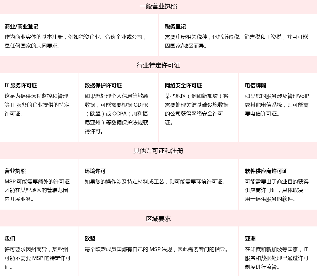 您的下一步是获得必要的执照和许可证。这对于依法经营您的业务至关重要。具体的先决条件可能因地理位置而异。以下是根据不同地理位置所需的一些常见类型的执照和许可证的细分: