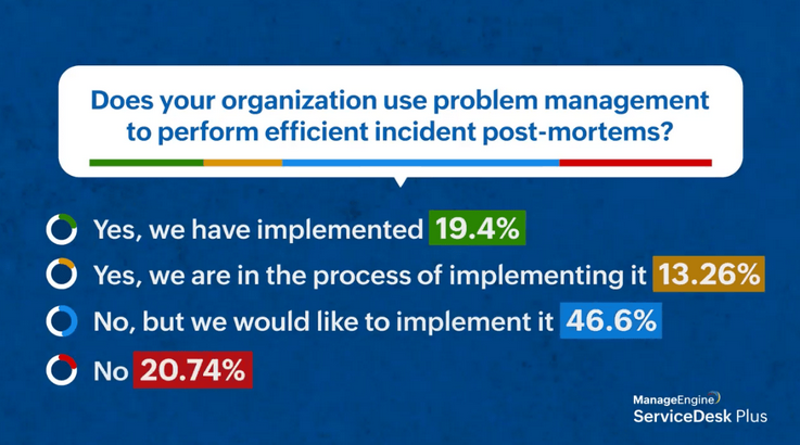 在IT技术人员和管理人员中,我们发现一个组织中,67.34%的组织缺少一个完整的问题管理计划,您的组织是否错过了高效的问题解决流程?ServiceDesk Plus可制定您自己的问题管理策略。