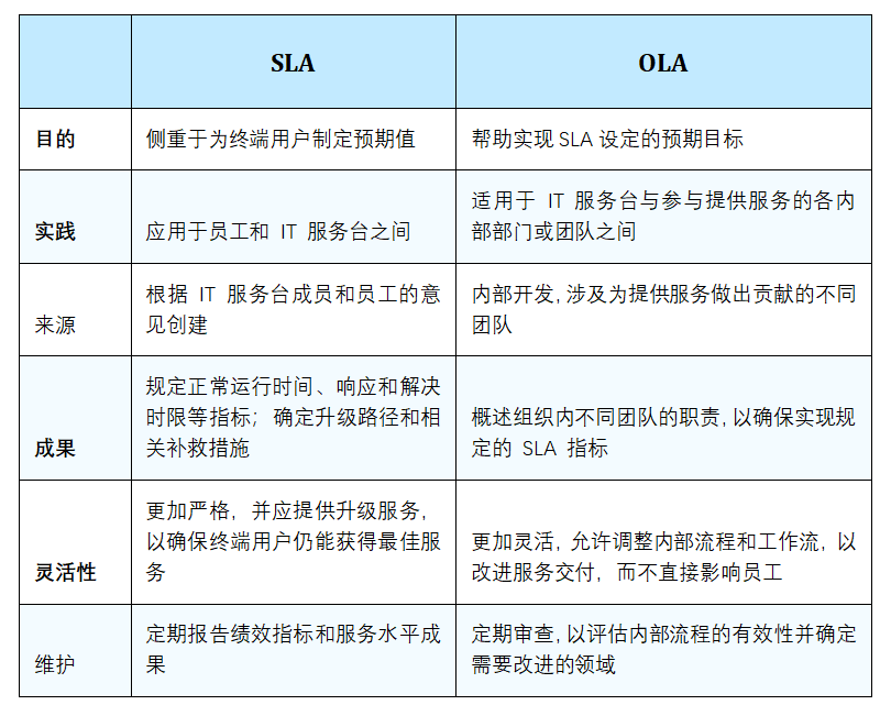 在服务交付方面,服务级别协议(SLA)和运营水平协议(OLA)是互为补充的两个概念。SLA 的制定旨在制定终端用户的期望,并激励服务台团队实现这些目标。而 OLA 则为参与 IT 服务不同部分的团队提供指导,明确每个团队应做出的贡献。