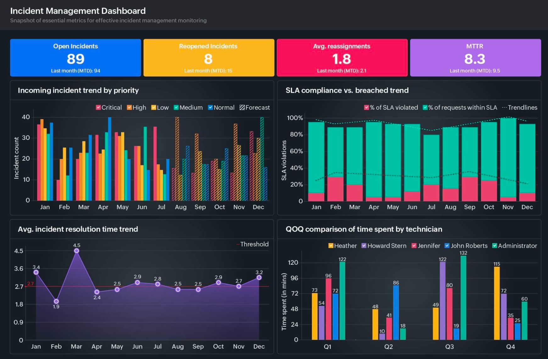 事件管理器的报告可突出显示关键指标和指数,如打开事件的数量、严重程度及其当前状态。图表或图形通常用于描述一段时间内的趋势,如事件数量、违反服务水平协议的情况、解决时间、重新打开的事件数量等。这些功能增强了知情决策的能力,提高了事件管理的效率。图 1 展示了 IT 事件管理人员常用的仪表板。