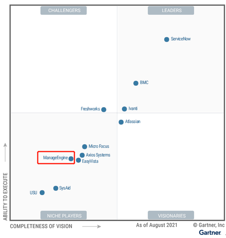 ManageEngine卓豪ITSM产品入围2021年Gartner魔力象限IT服务管理工具细分市场。这是ManageEngine卓豪连续第二年进入魔力象限。