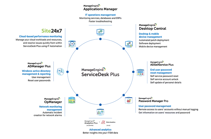 ServiceDeskPlus本地版本集成了ManageEngine卓豪的IT管理应用程序套件,组织机构能够实时监控并管理其IT活动。