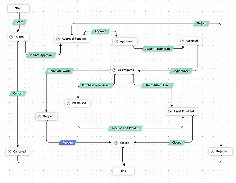 服务管理从业者可以在 ServiceDesk Plus 中轻松设计、构建和部署可扩展的数字工作流。使用图形工作流构建器,您可以拖放各种节点以按照您想要的方式构建工作流,并将自动化注入其中。