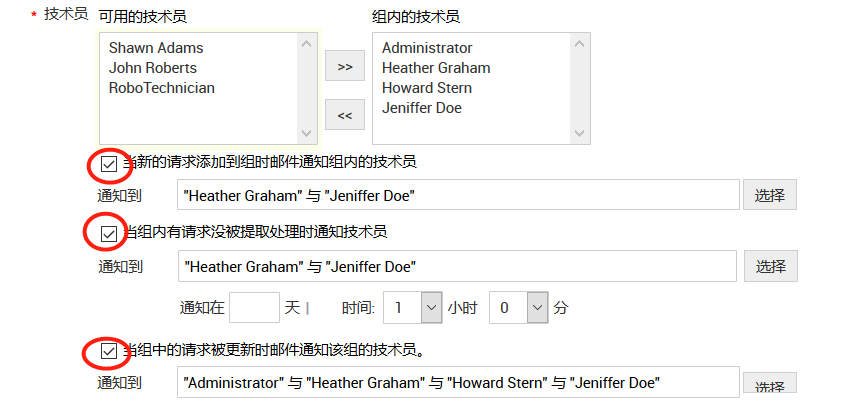 选择通知支持组的所有技术员。