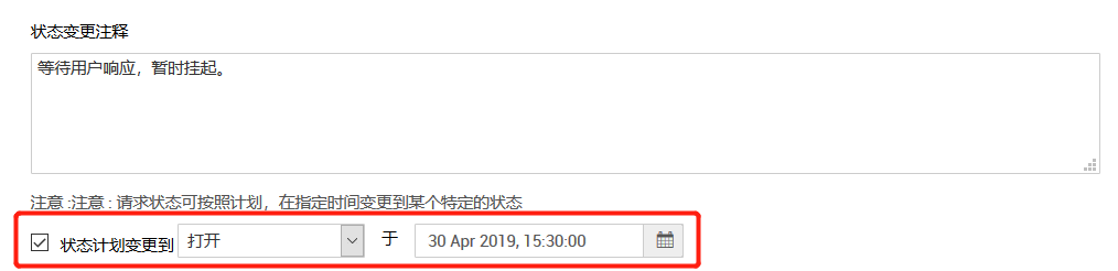 请进入请求->选择并编辑工单->将状态从打开变更为保留->单击图标->出现以下弹出窗口,配置工单自动打开的日期和时间。