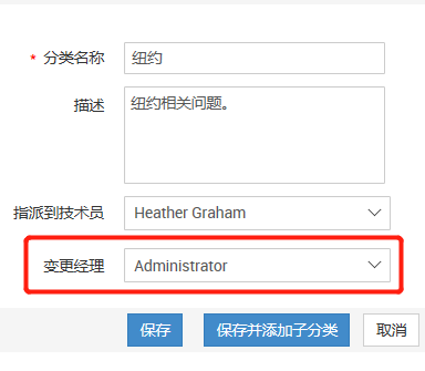 请转到“管理”->“帮助台自定义程序”->“类别”(选择并编辑类别)->配置变更经理。