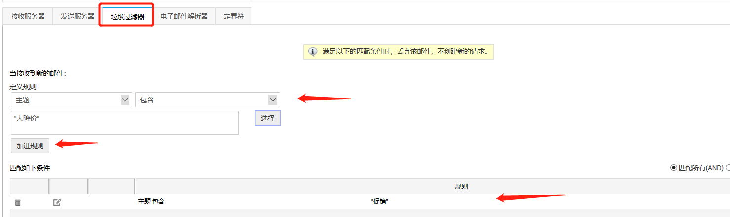 符合定义标准的电子邮件将在进入ServiceDesk Plus前被过滤掉。