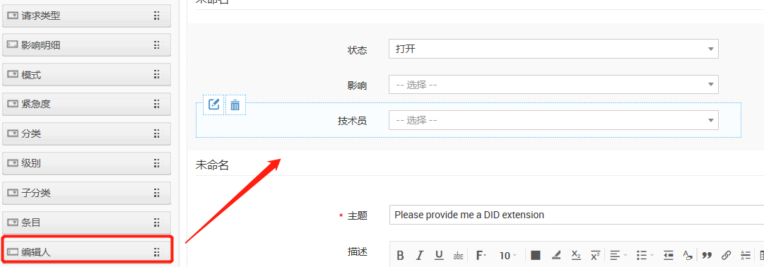 管理>服务目录>选择一个模板>从左侧的窗格中将编辑人拖选至模板中