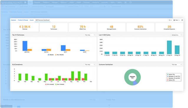 通过ServiceDesk Plus MSP 10.5的业务仪表板,您可以在一个屏幕上:追踪营收的来源,发现表现最好的技术员,监控客户满意度水平并发现更多。