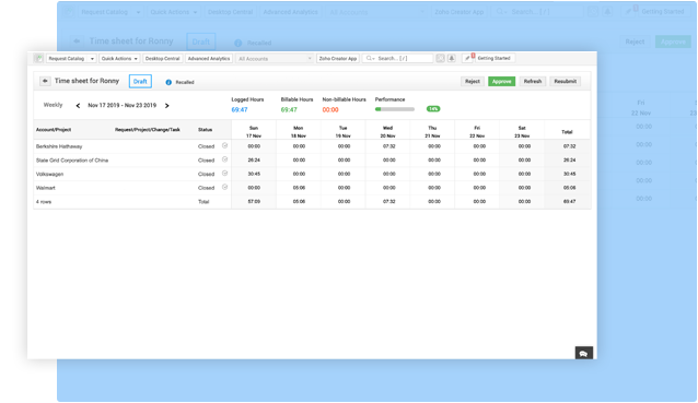 由于不正确或不充分地对技术员在各种服务台活动上花费的时间和精力的追踪,会导致在记帐和工资核算过程中经常出现错误。 ServiceDesk Plus MSP 10.5可以将工单工作日志自动转换为时间表的条目,这样可以接收技术员参与的所有活动的状态,记录工时,计费工时和非计费工时的合并视图。技术员还可以在向客户开具发票之前通过简单的审批流程发送这些条目,以避免出现任何差异。