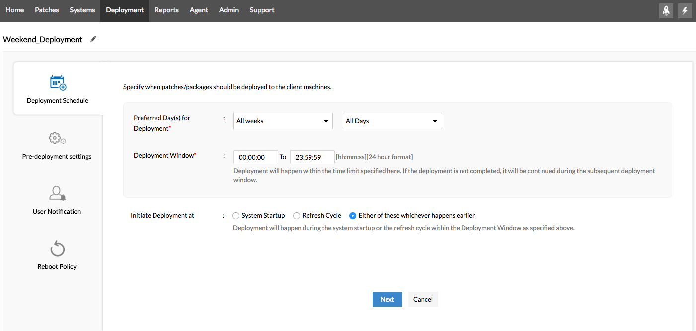 此功能在部署窗口到来之前,将二进制文件下载到客户端计算机。这些二进制文件将在后续的刷新周期、系统启动窗口或部署窗口内下载(以较早者为准),而部署仅在指定的部署窗口内启动。例如,部署窗口是从下午4点到晚上10点。该政策已于下午2点创建。下一个刷新周期是下午3:30。部署窗口启动后,这些补丁将部署到相应的客户端计算机。