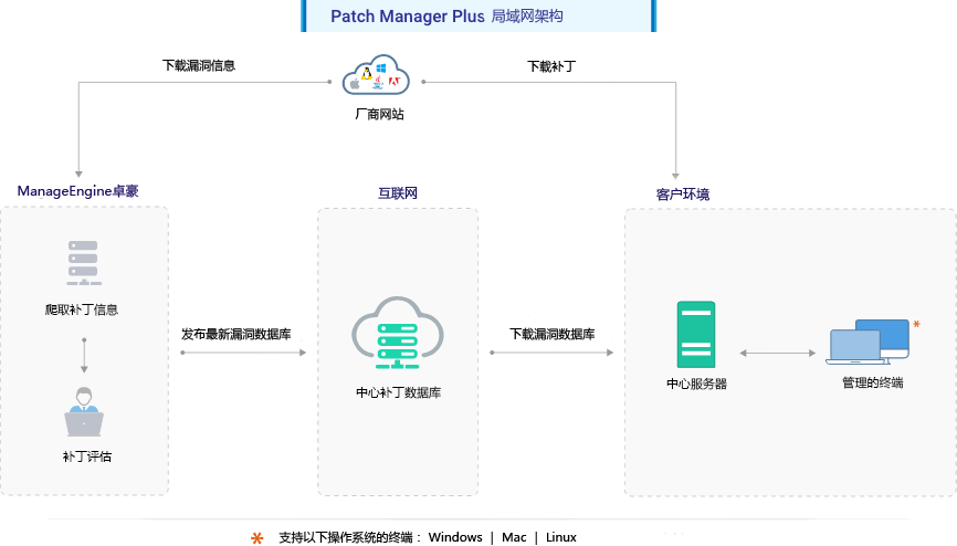 补丁数据库是ManageEngine网站上的一个门户。它托管了在补丁经过测试后发布的最新漏洞数据库。Patch Manager Plus服务器会定期同步此信息,并扫描网络中的计算机以确定缺失了哪些补丁。然后在缺失补丁的计算机上安装这些补丁。