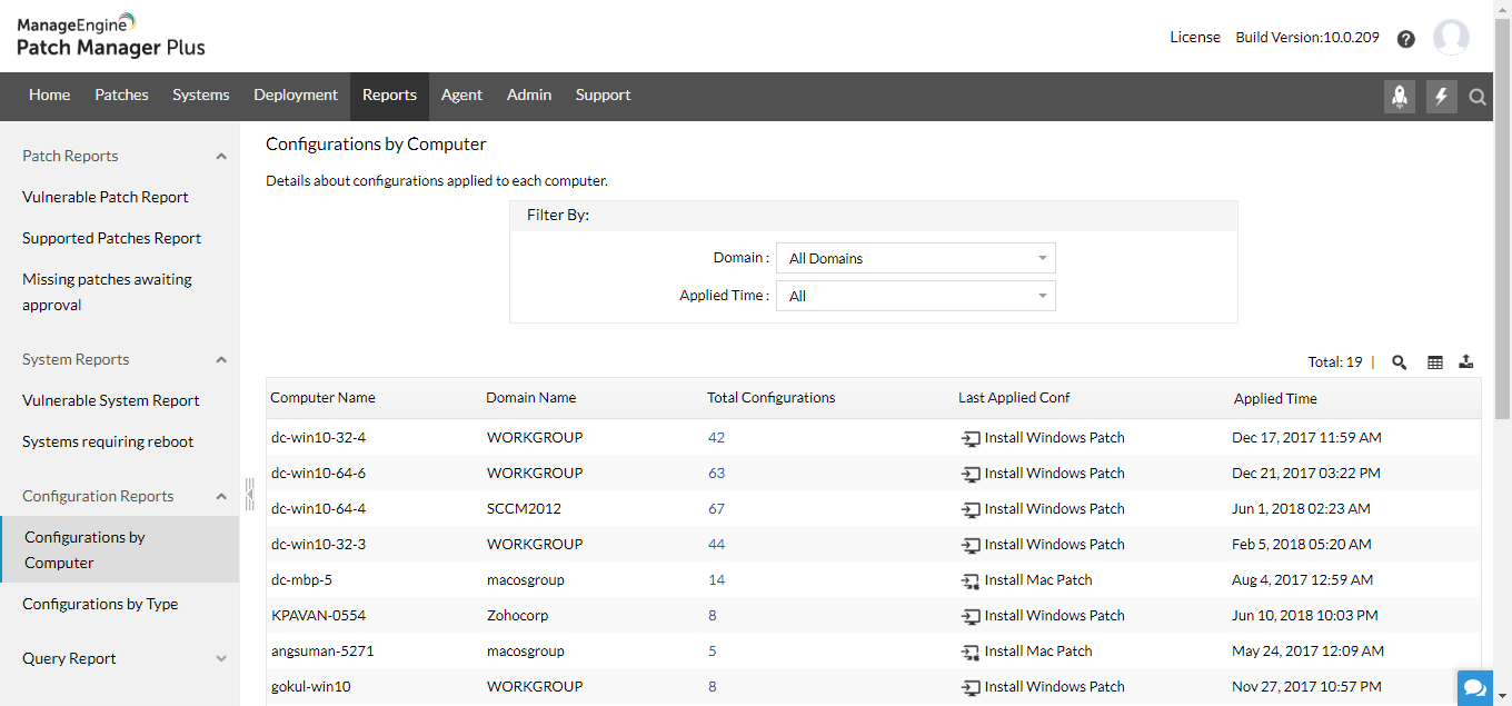 此报表列出了应用于每台计算机的补丁配置的详细信息。它有一个过滤选项,可用于根据域和应用的时间获取自定义数据。