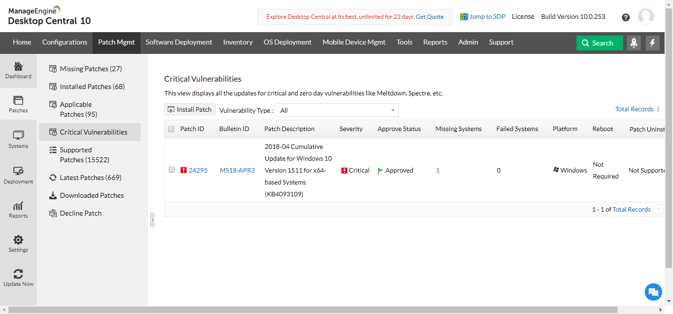 此报表显示零和关键日漏洞(如Meltdown、Spectre等)的所有更新。您将获得一个过滤器,可用于列出特定漏洞类型的补丁。用户可以通过点击“安装补丁”直接安装这些补丁。