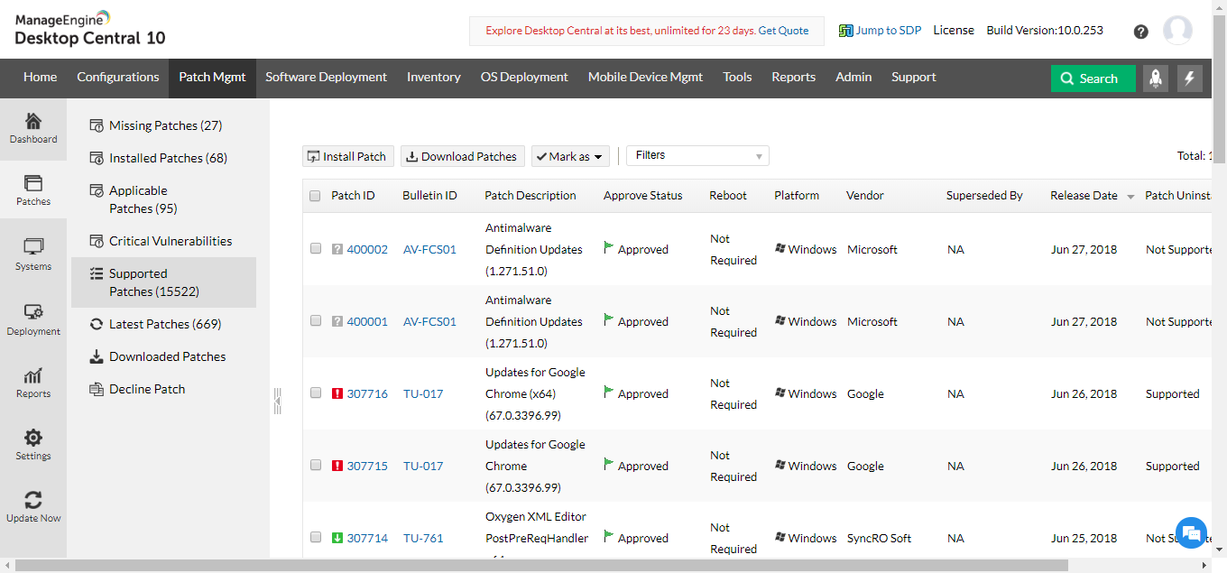 “支持的补丁”报表提供Microsoft 公司发布的所有补丁的详细信息,而不考虑这些补丁是否与您的网络相关。当您计划安装最新应用程序/可用于应用程序的更新,以便对网络中的系统进行升级时,“支持的补丁”报表必不可少。