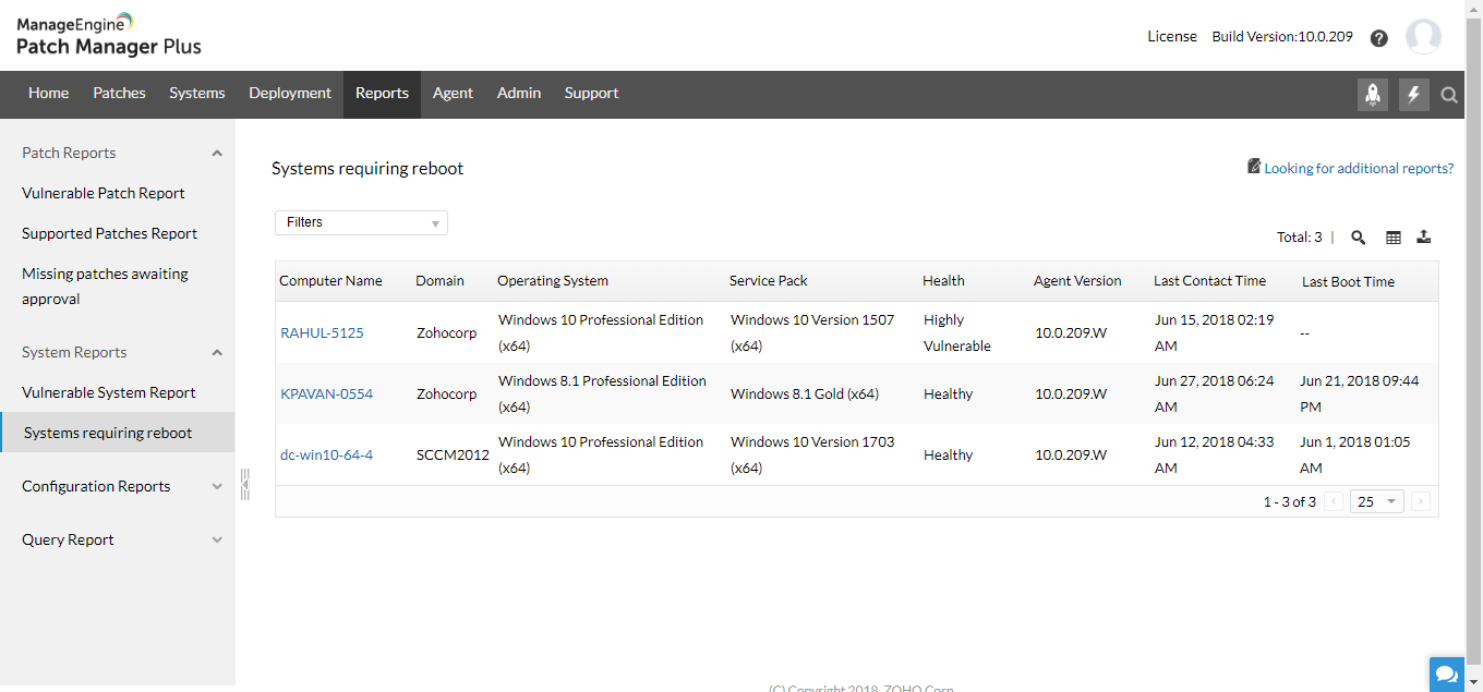 在所有成功的补丁策略中,最后一步都是生成报表。Patch Manager Plus可以帮助您运行详尽的报表,轻松过滤数据,以及以各种格式与他人分享结果,从而帮助处理漏洞。各个报表可以帮助您跟踪重要更新、安装状态、失败的更新、漏洞数据库更新等。