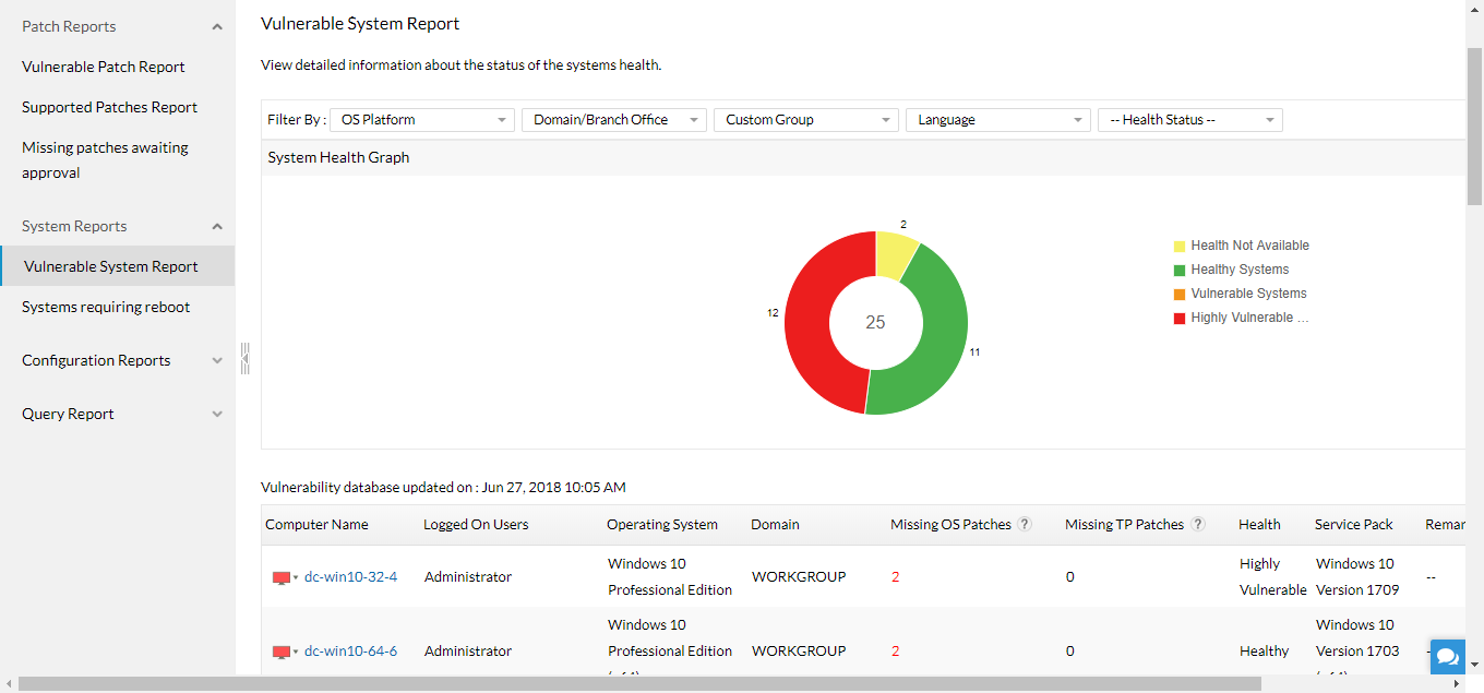 Patch Manager Plus的“易受攻击的系统”报表提供网络中运行状况正常和易受攻击系统的详细信息。为了减少因为存在易受攻击的系统而产生的风险,这个补丁报表极为重要。您可以深入探索此报表,以获取易受攻击的系统中安装的和缺失的补丁的相关信息,这些信息将按应用程序列出