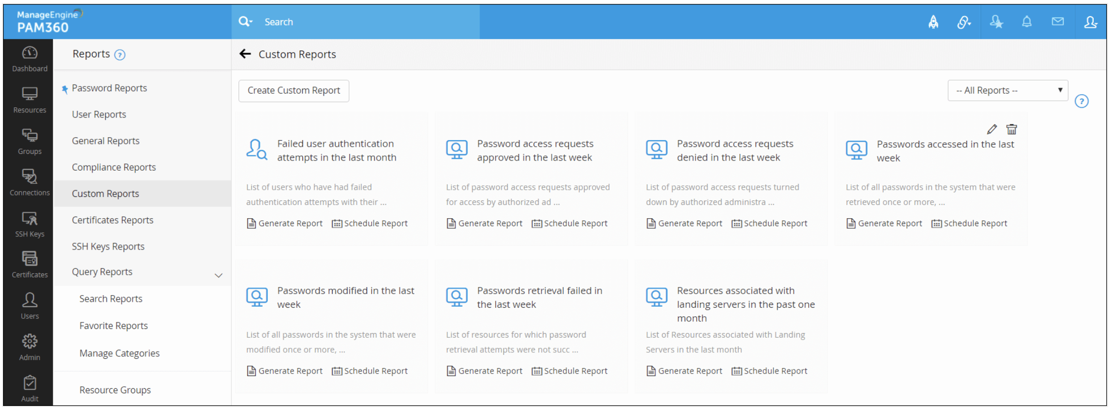 PAM360 允许您生成定制化的报表,您可以在其中组合来自审计记录和一般状态报表的独立详细信息集,以获得有用的信息。您可以利用可用数据来满足审计要求、安全要求和各种合规性需求。管理员可以通过指定细粒度的过滤条件,轻松地从 PAM360 的数据库中提取所需的信息。例如,如果您的安全审计需要部门使用密码的快照,您可以指定适当的标准并生成特定于部门的报表。