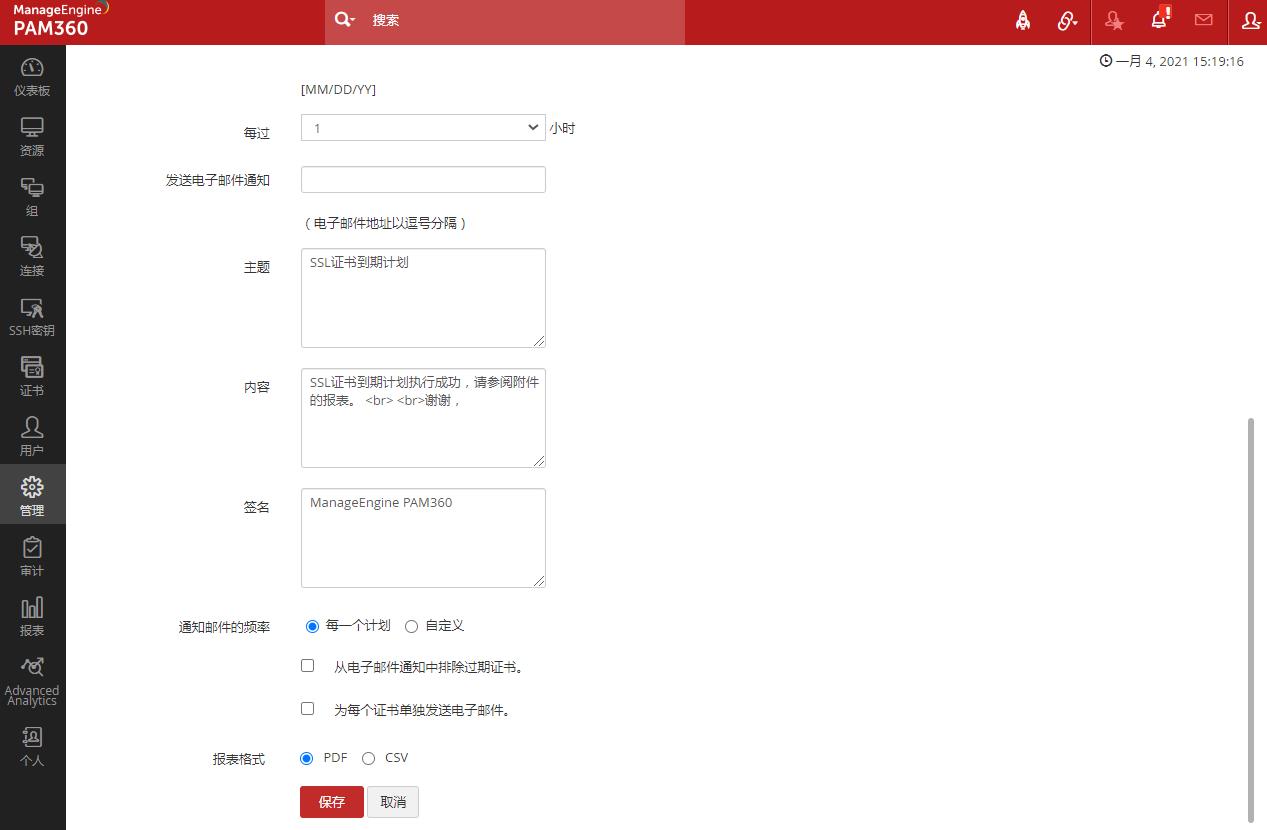 - 报表 设置要生成并发送到指定的电子邮件地址的报表计。 PAM360生成的所有报表都可以通过此选项设置计划发送到电子邮件地址。