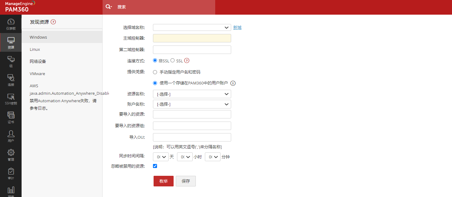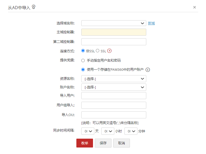 在从AD导入用户或资源时,PAM360提供为AD域的组或组织单元配置自动同步的选项,以确保用户数据库始终更新。 要设置同步,您必须首先输入PAM360与AD进行同步的时间间隔,同时提供域详细信息以启动导入。 时间间隔可以精确至一分钟,也可以是小时/天的时间间隔范围。