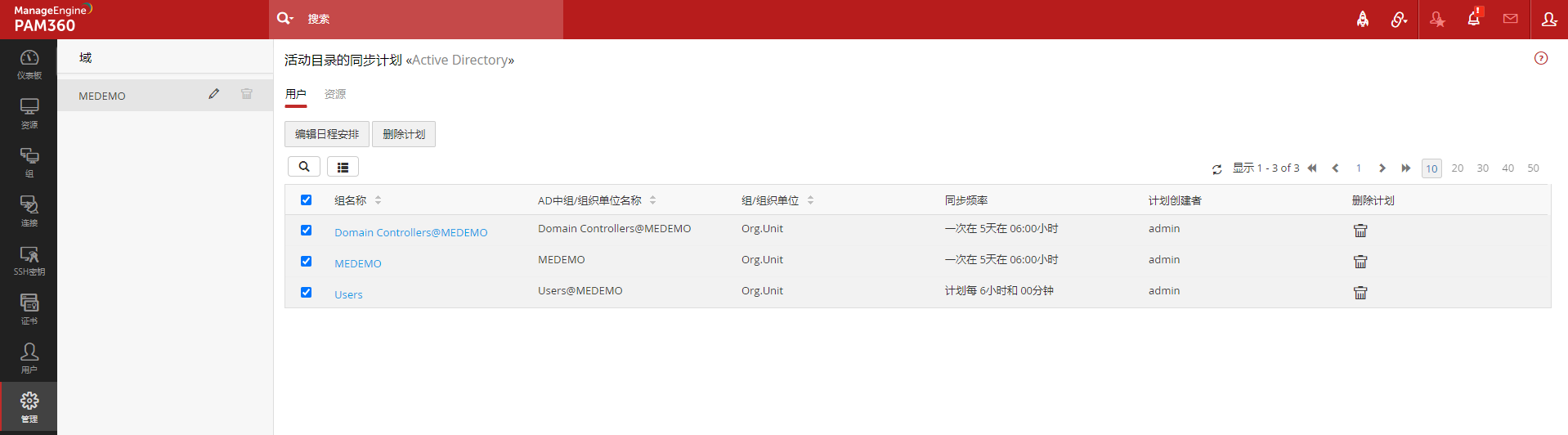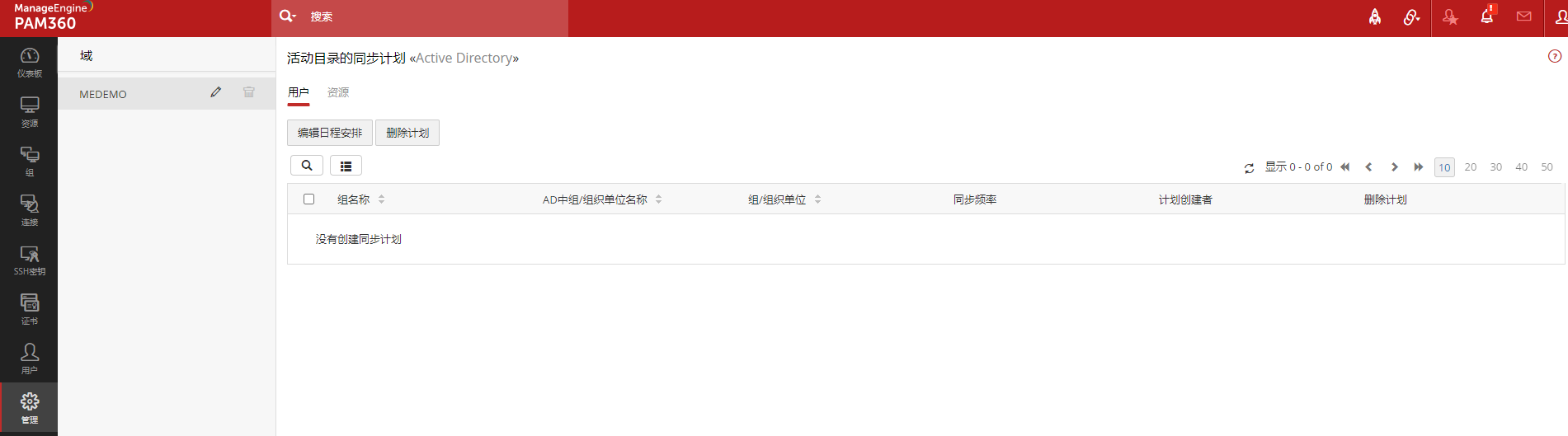 您可以导航到管理 >> 活动目录 >> 查看同步计划 , 为不同 AD 域配置同步计划。 已配置同步的所有AD域都将在页面的左边边栏导航选项卡中,此外,为用户和资源配置的同步计划将分别显示在不同的选项卡下: