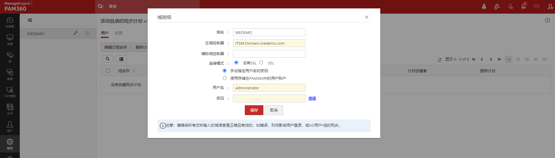 注意:PAM360 将在下次尝试与域通信进行数据同步时使用修改后的详细信息。