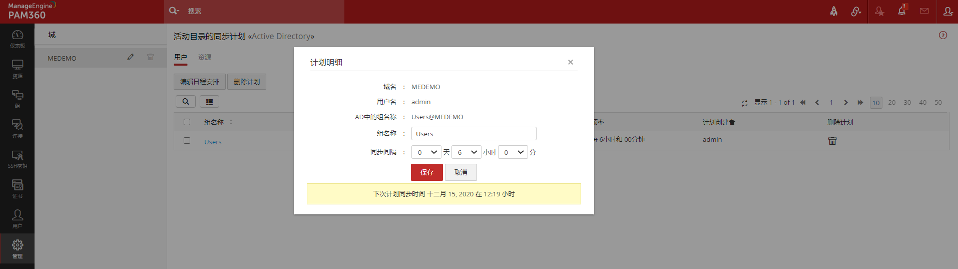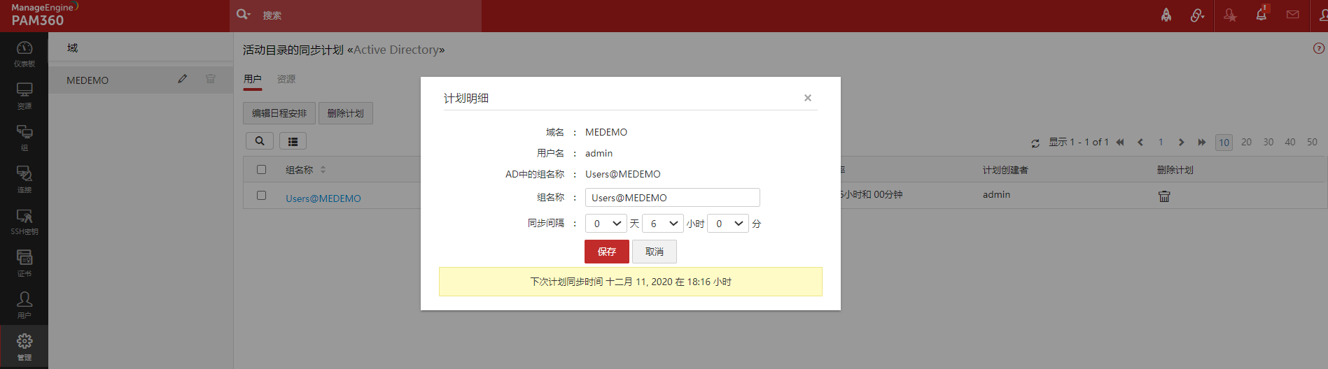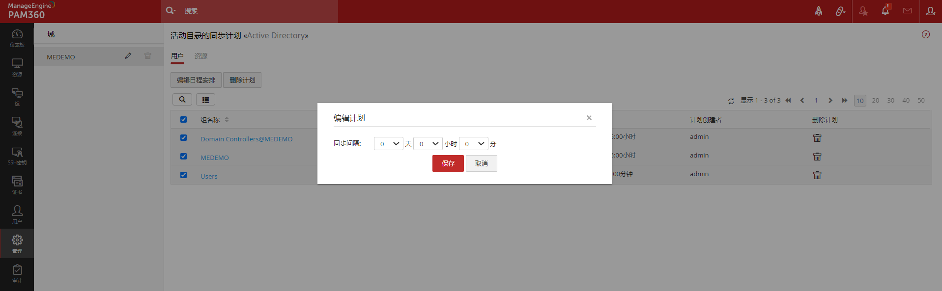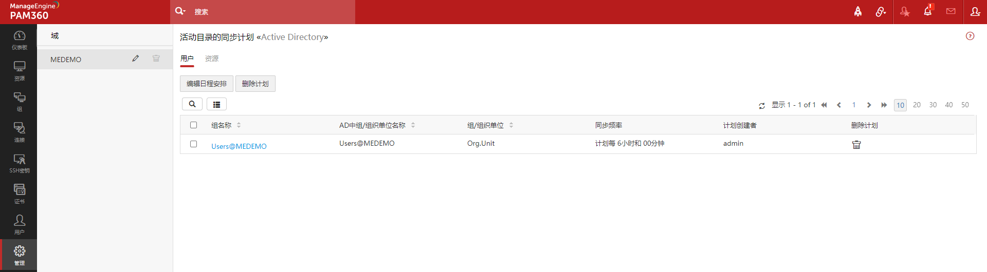 如果您在执行用户/资源导入操作时为AD域配置了同步计划,您可以在这里修改计划,并分别为该域中的组/组织单元设置不同的同步时间间隔。