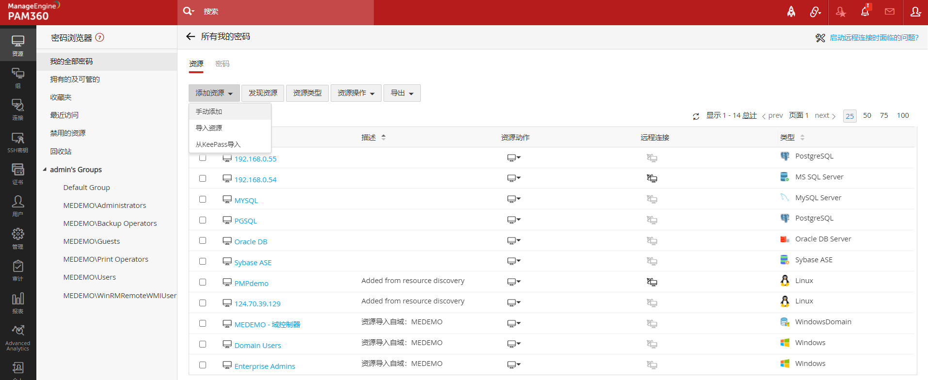 为了管理特权帐户的密码,您应该在PAM360中添加终端作为资源。 我们使用术语"资源"来表示任何服务器、应用程序、网络设备或持有用户帐户和密码的设备。 向PAM360添加资源的方式有:手动添加、文件导入和资源发现。