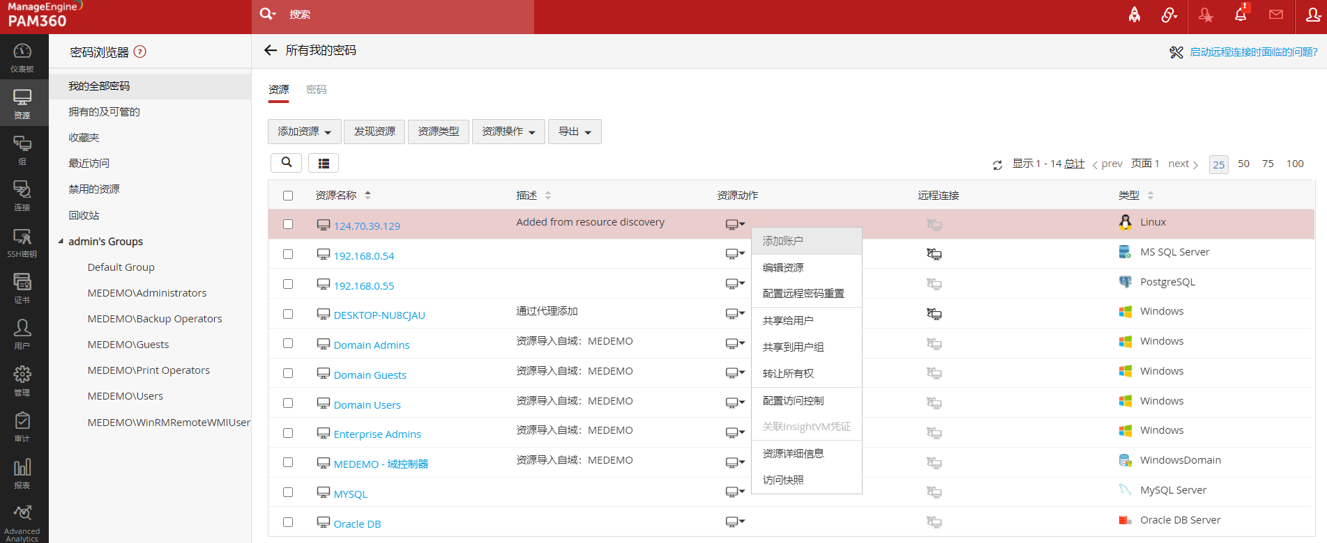 除了超级管理员(仅在PAM360中配置后)外,其他任何人包括admin用户,都不能看到您添加的资源。但是,如果您与其他管理员共享您的资源,他们就能够看到。
