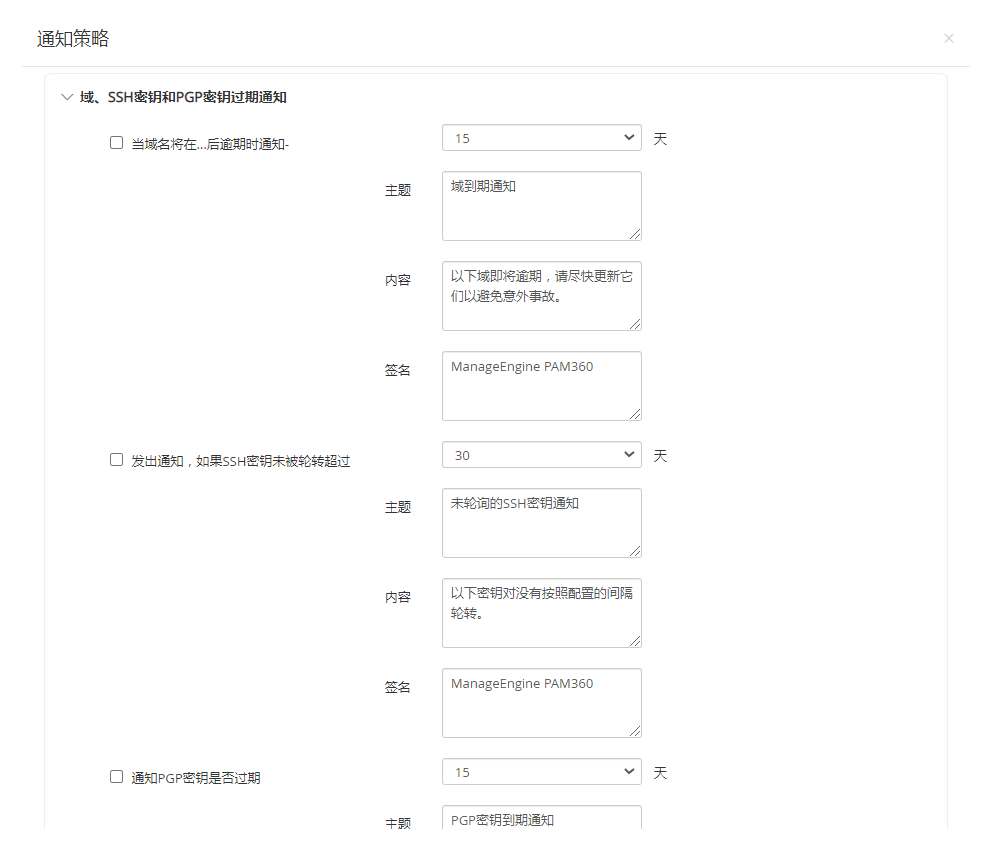 PAM360 允许您为各种操作(如 SSL 密钥到期、失败的 SSH 密钥轮换、证书管理、 PGP 密钥到期等)启用通知。此外, PAM360 允许您保留或覆盖现有密钥。 在本节中,您将了解以下主题: