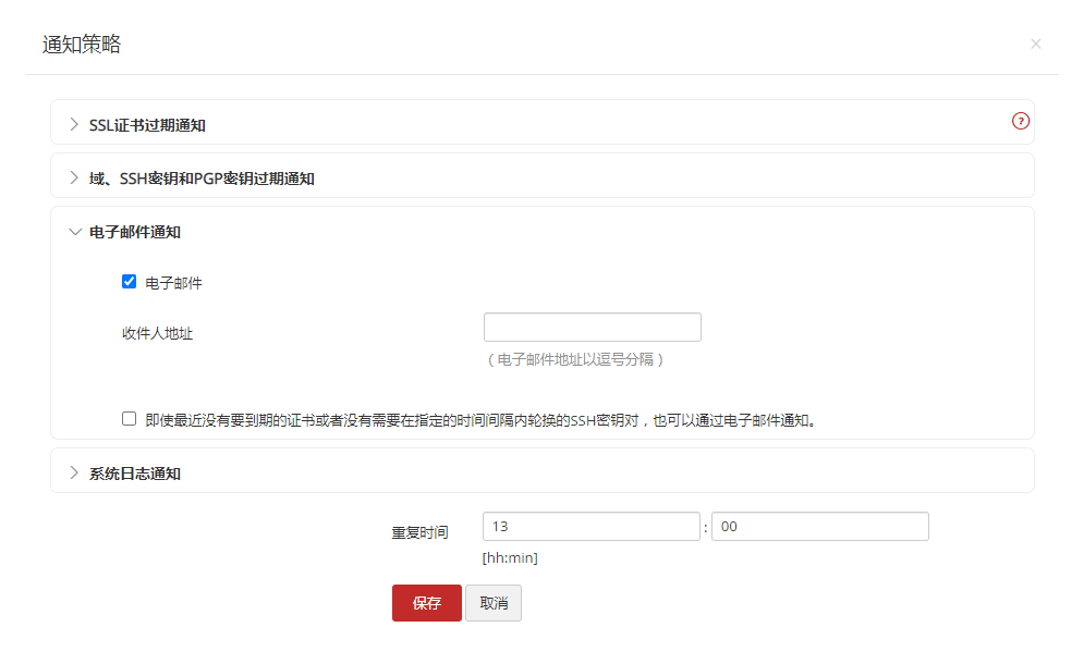 - 您也可以通过选中相应的复选框来选择在配置的时间段内或两者同时获得有关域名到期,PGP密钥到期或SSH密钥轮换失败的通知。SSL过期,以及在指定的日期内未轮换的SSH密钥将在上述“计划时间”内得到通知 。