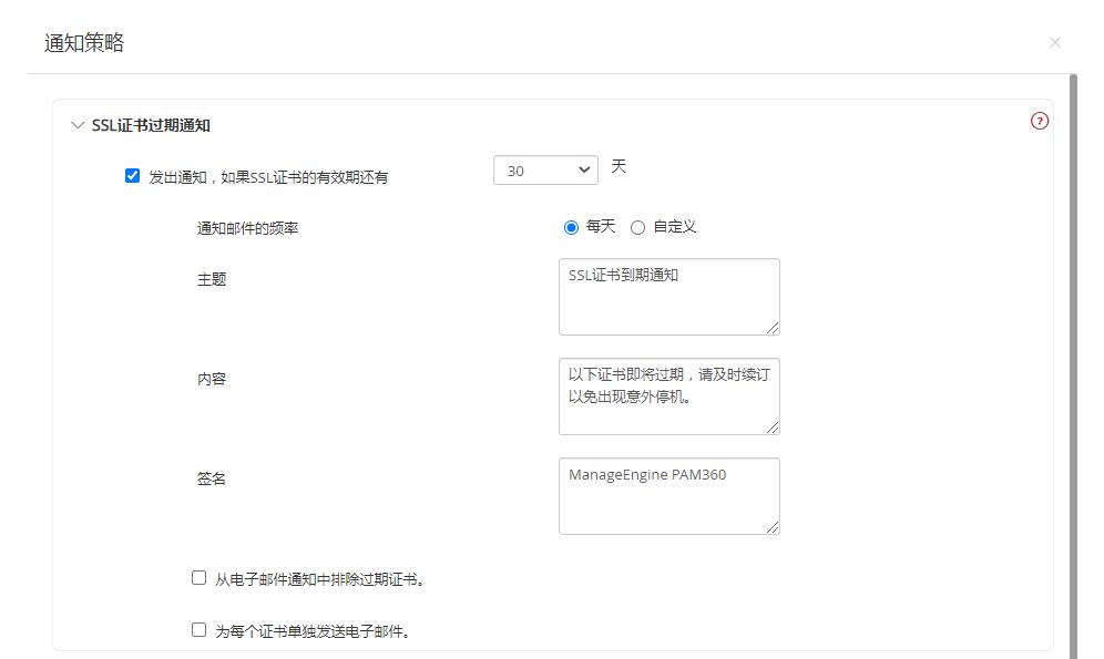 - 选择“从电子邮件通知中排除过期的证书” 不接收有关过期证书的通知。