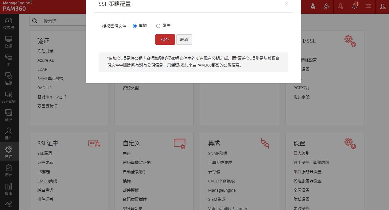 - 覆盖:从授权密钥文件中删除所有现有的公共密钥信息,仅保留从PAM360部署的公共密钥。