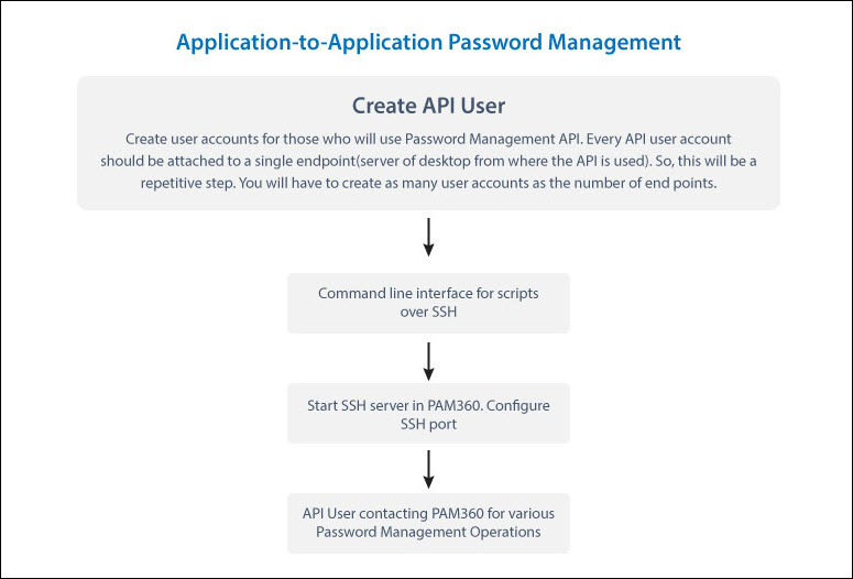 创建 API 用户并在 PAM360 中启动 SSH 服务器后, API 用户可以访问 PAM360 来获取分配给他们的密码。 请注意, PAM360 中的所有权和共享机制对于 API 用户也同样适用。也就是,API 用户只能访问分配给他们的密码。 使用密码管理 API ,用户可以检索、修改和创建帐户。