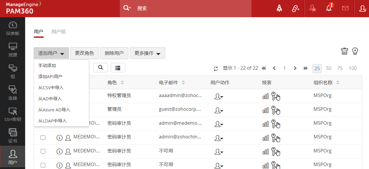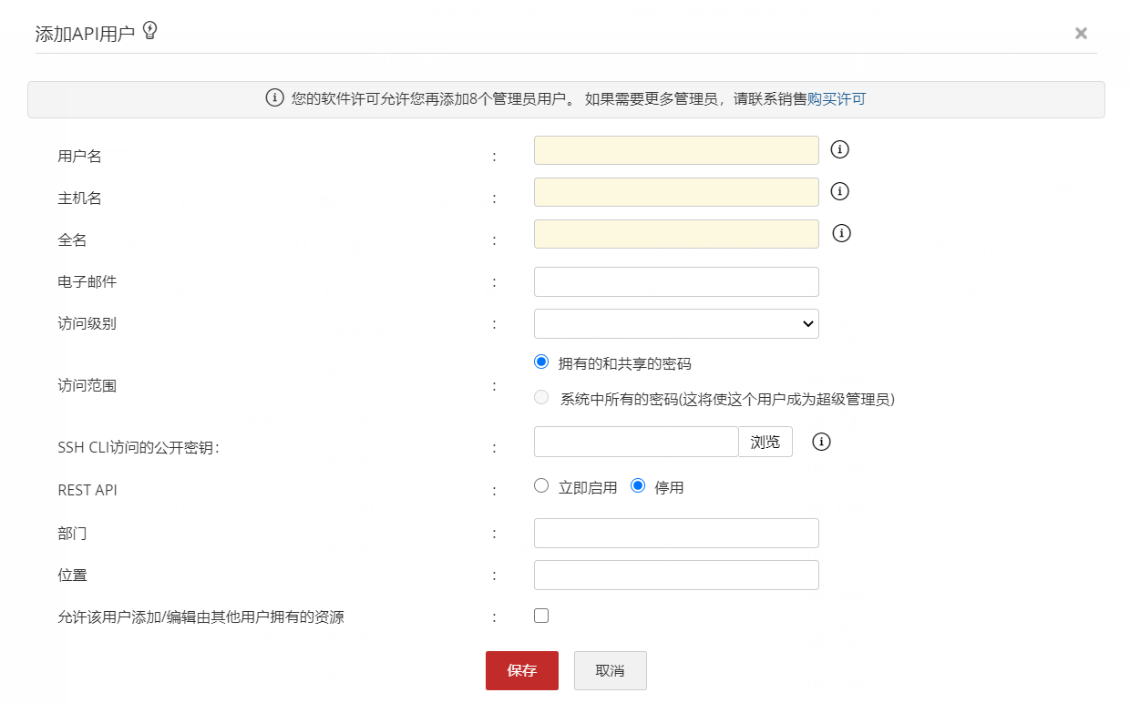 - 这些仅使用PAM360 API的用户,必需在PAM360中创建出来。每个API用户帐户都应指示单个终结点(使用 API 的服务器或桌面,故API用户帐户唯一标识格式为 user@hostname) 。