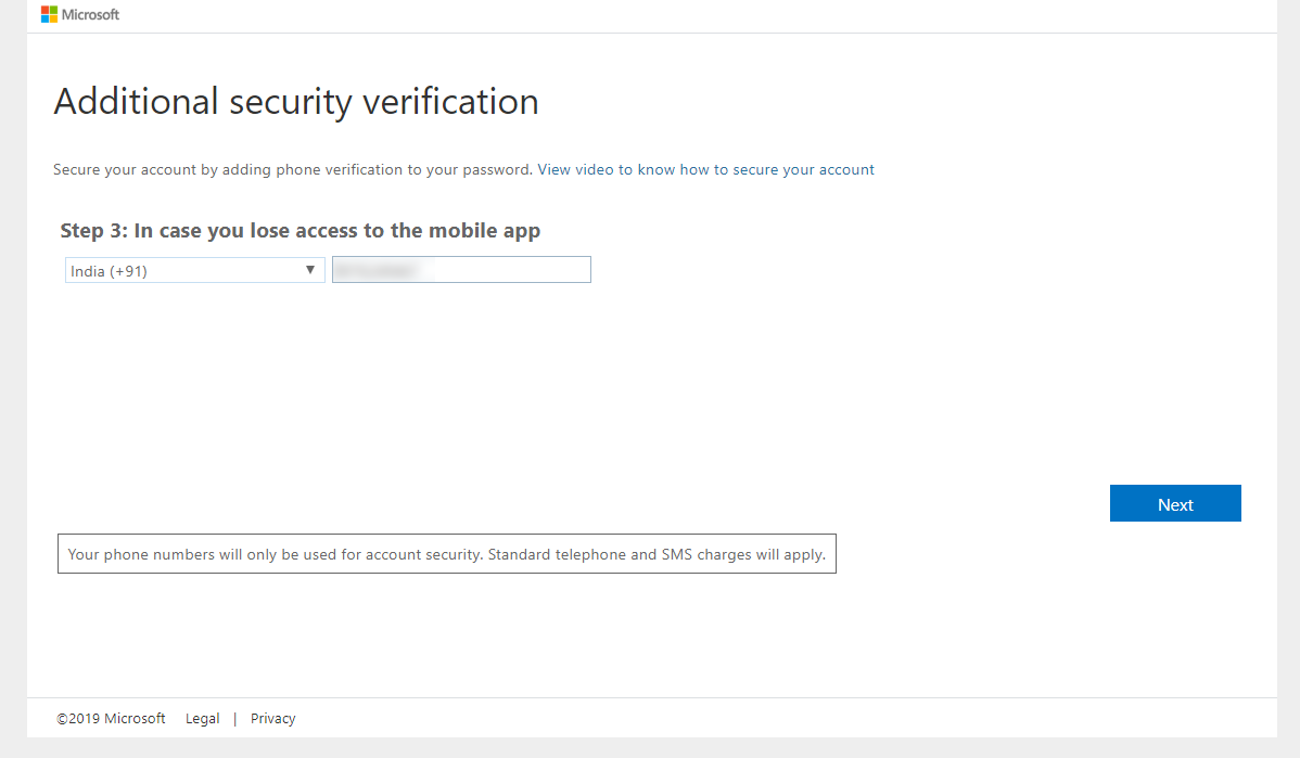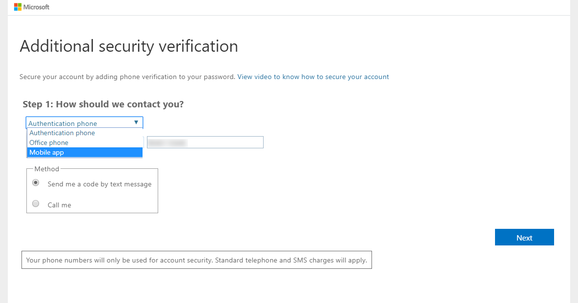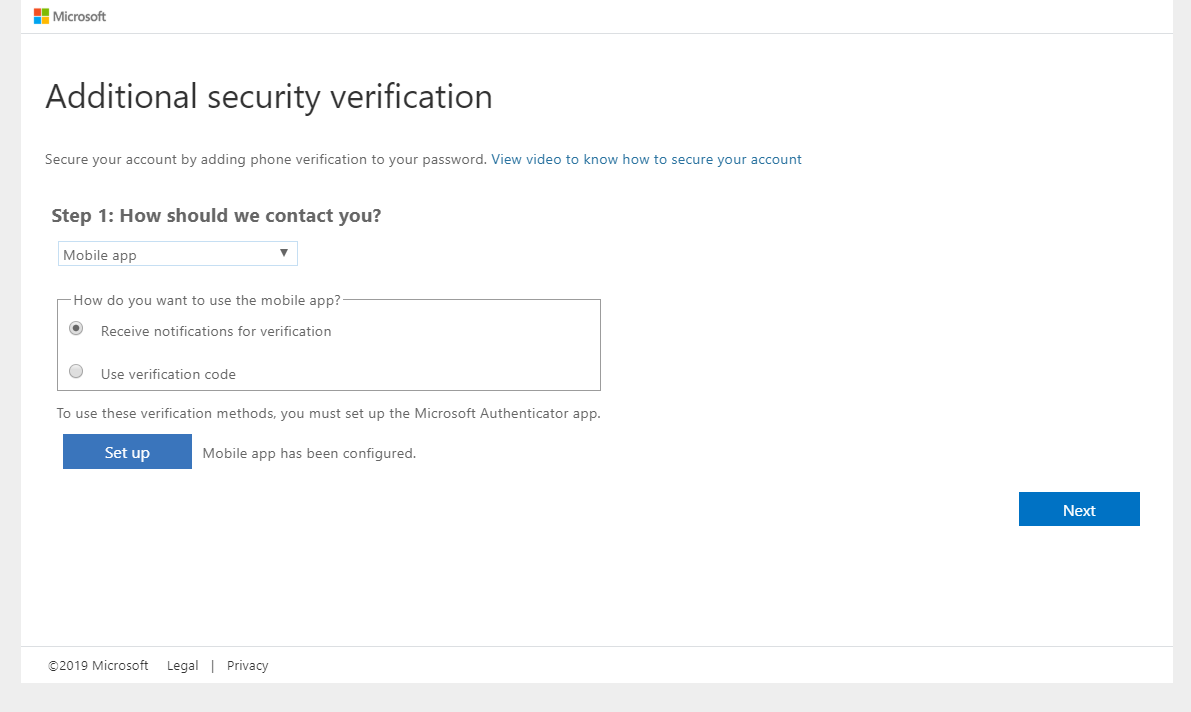 - 登录后,您将被重定向到附加的安全验证屏幕,请从下拉菜单选”Mobile app”,并选中“接收验证通知”,然后点击下一步。