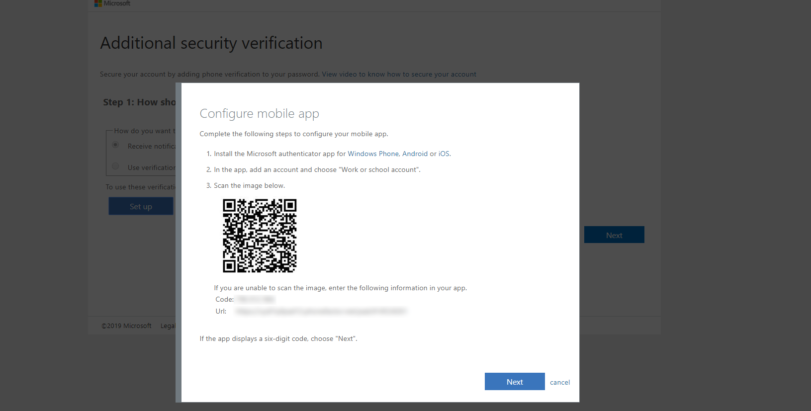 - 打开手机上的 Microsoft 身份验证器并扫描页面显示的二维码,点击下一步。