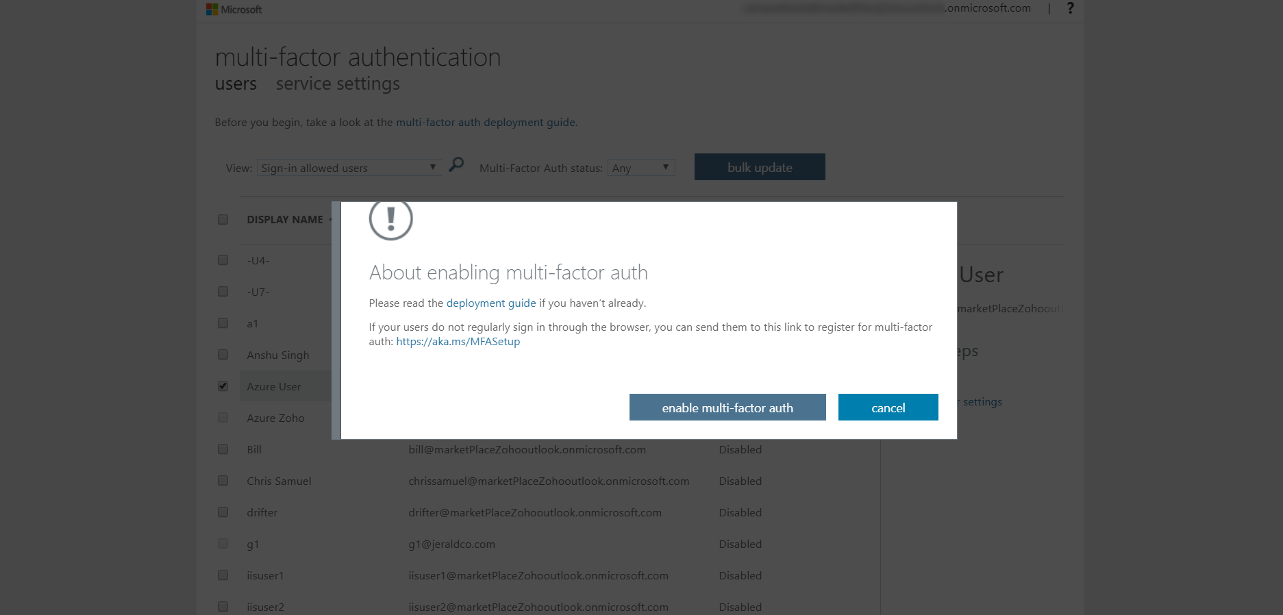 - 点击页面顶部的'Multi-Factor Authentication'(多因素身份验证)选项,页面将弹出一个新窗口。