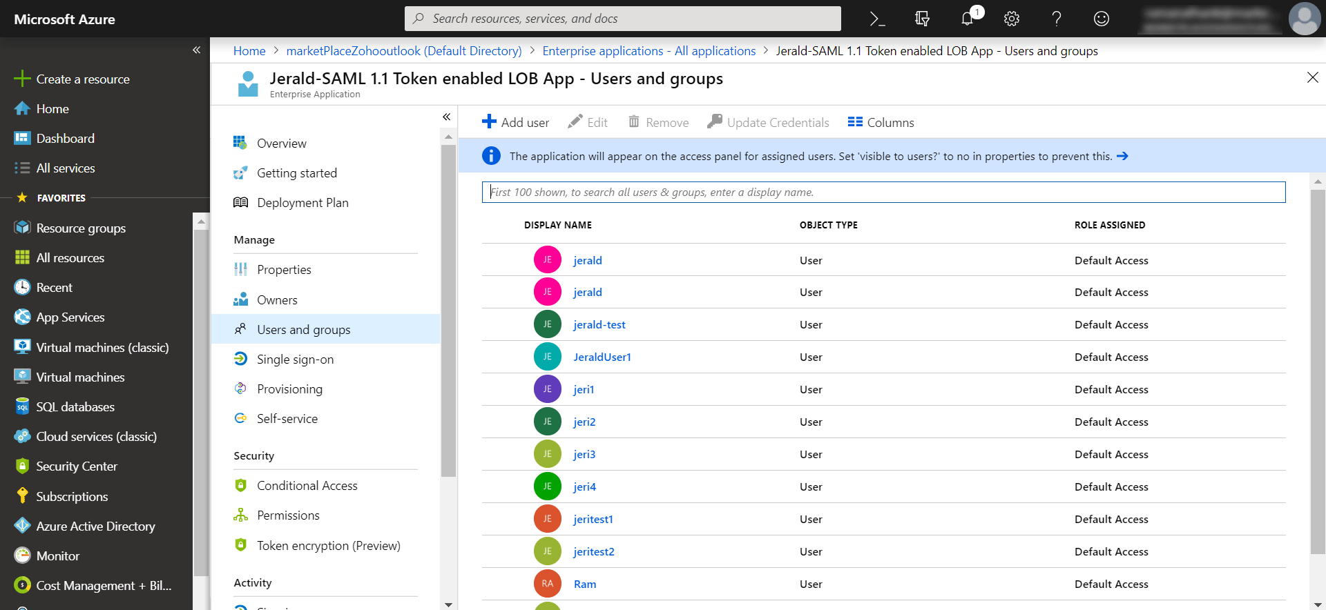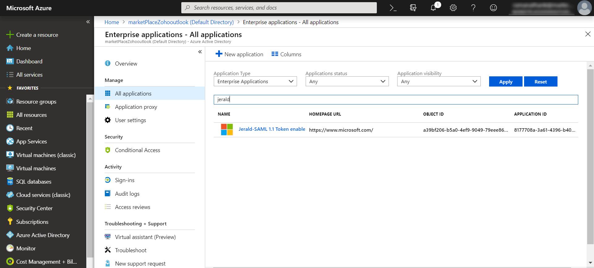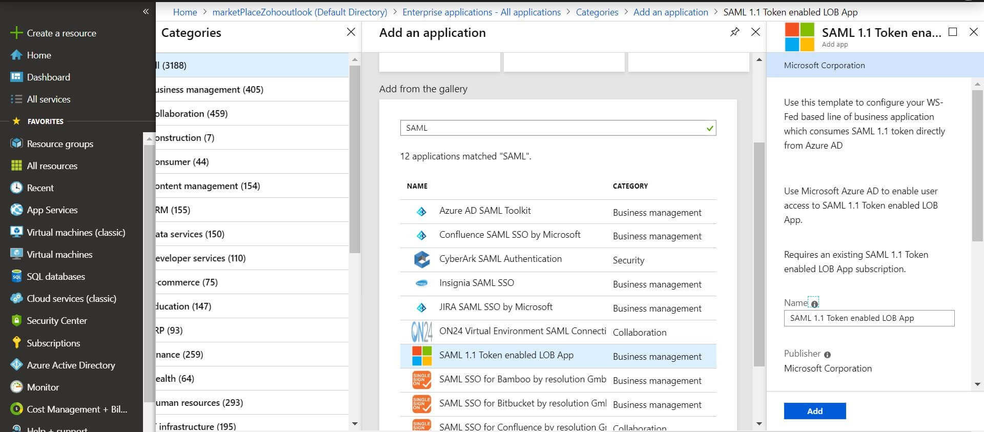 - 在搜索结果中,点击“SAML 1.1 Token enabled LOB App”, 右侧窗口将打开该应用。