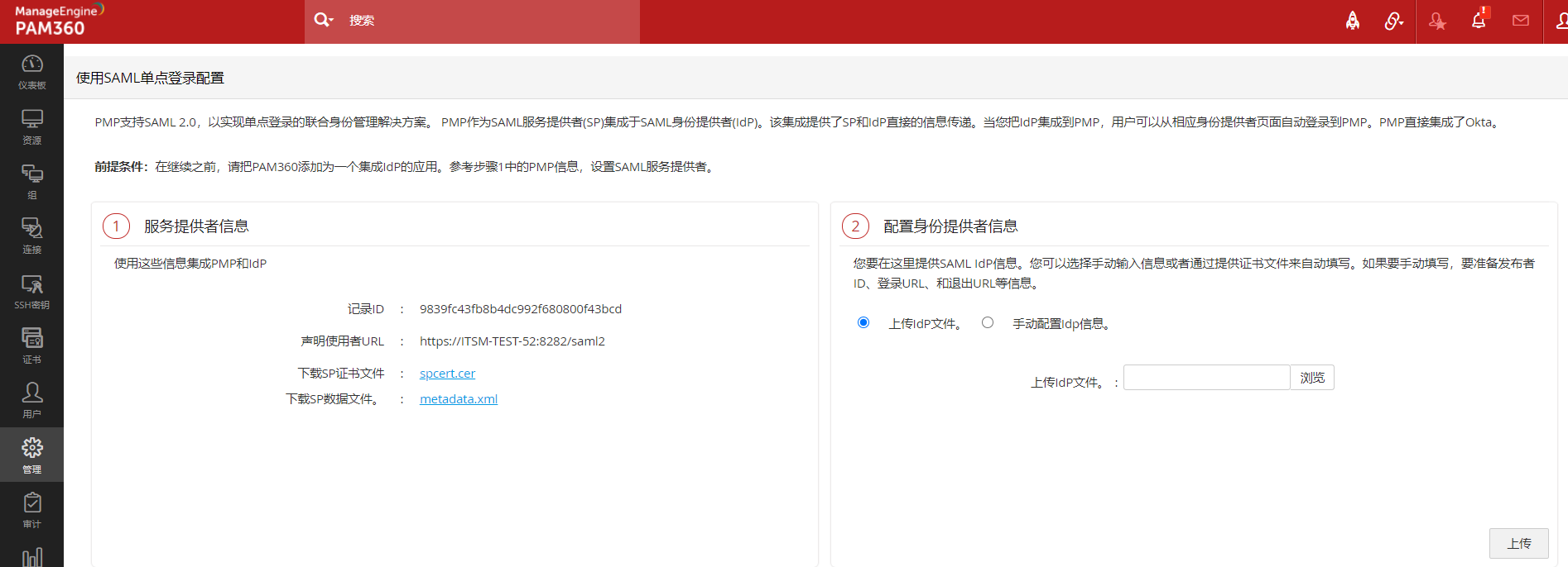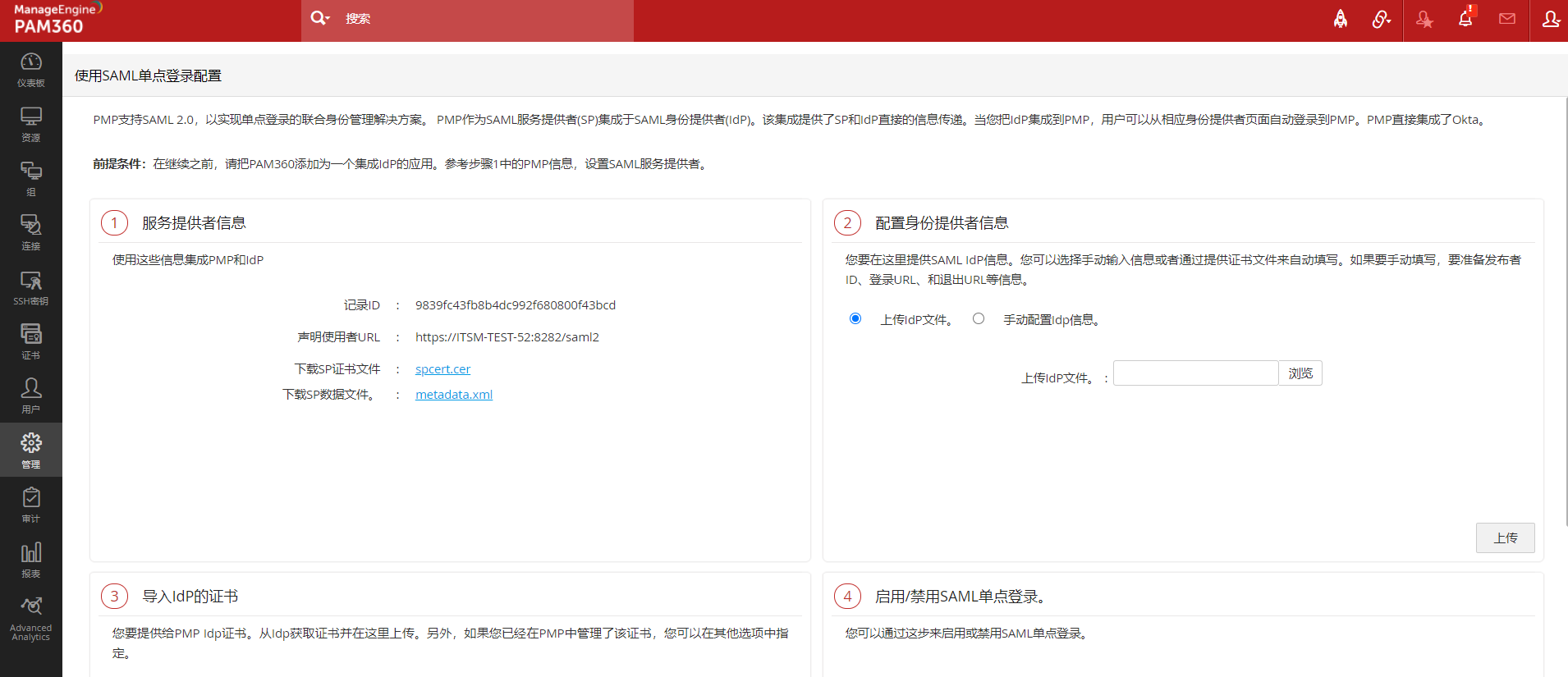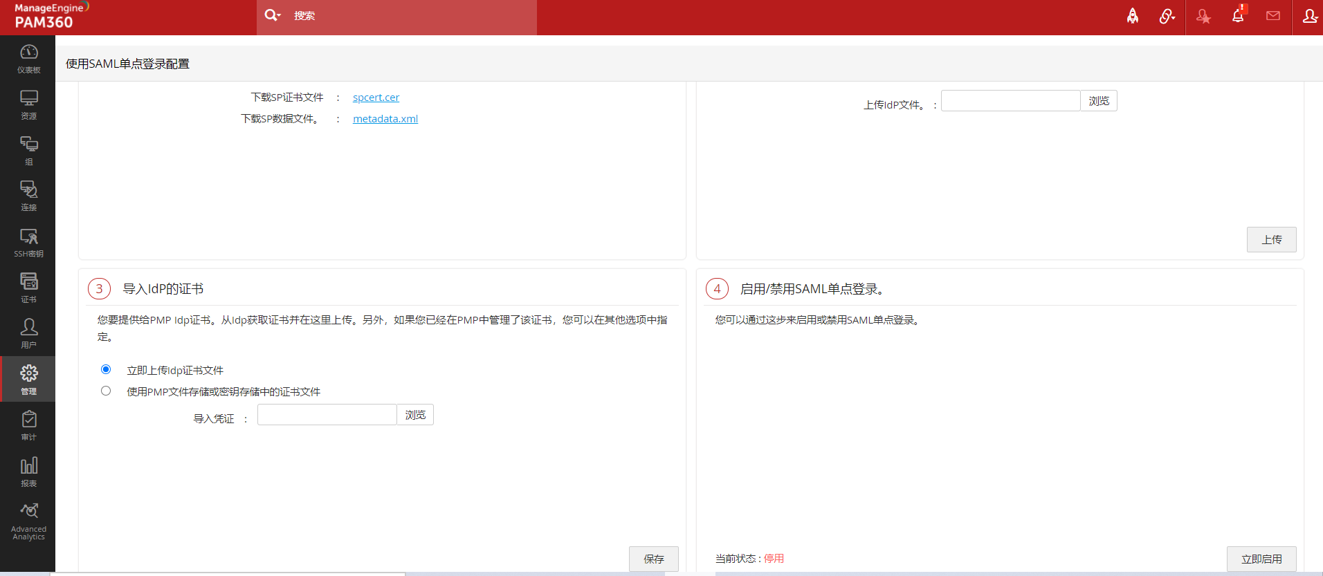 - 返回PAM360,导航到管理 >> 验证 >> 配置 SAML 单点登录。