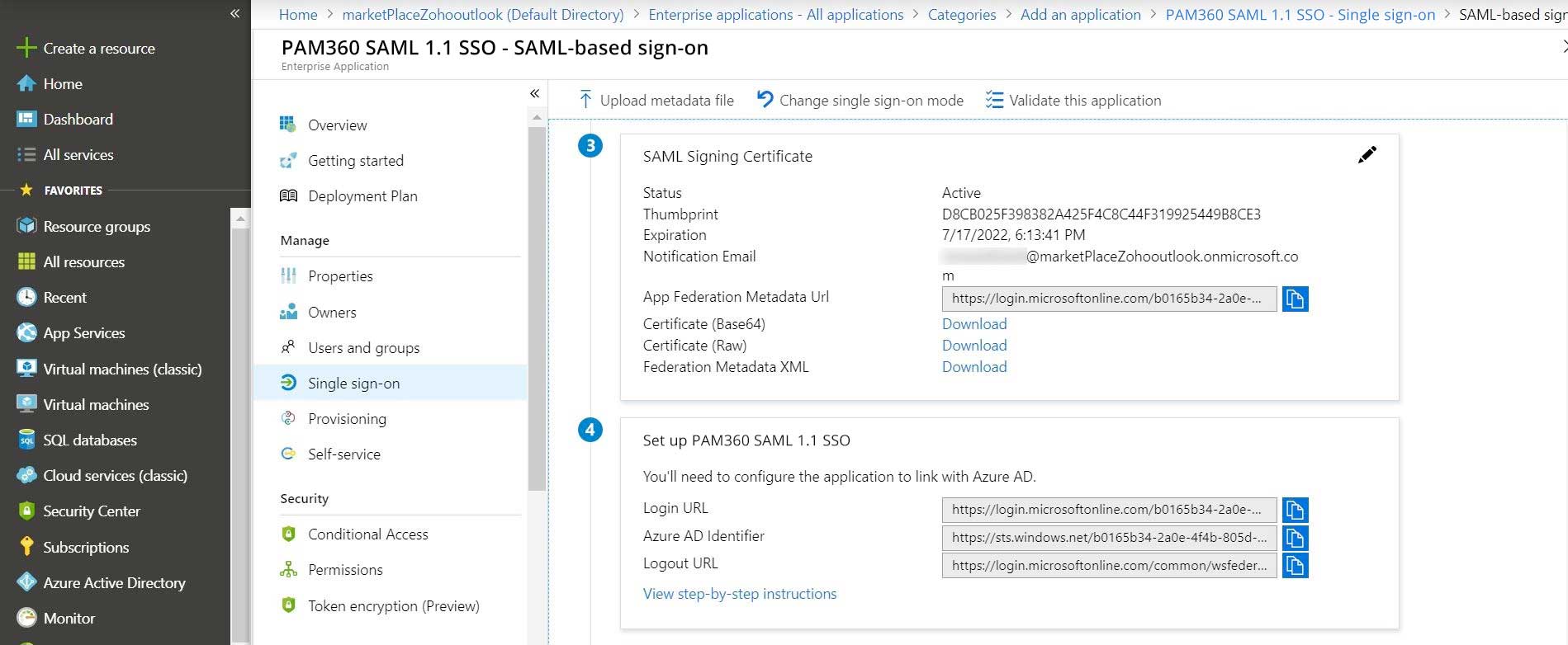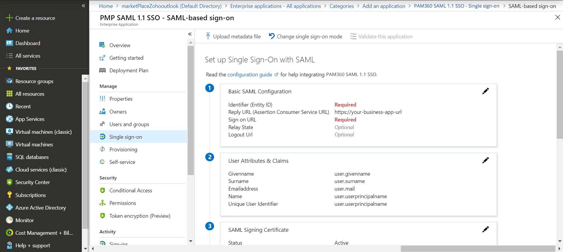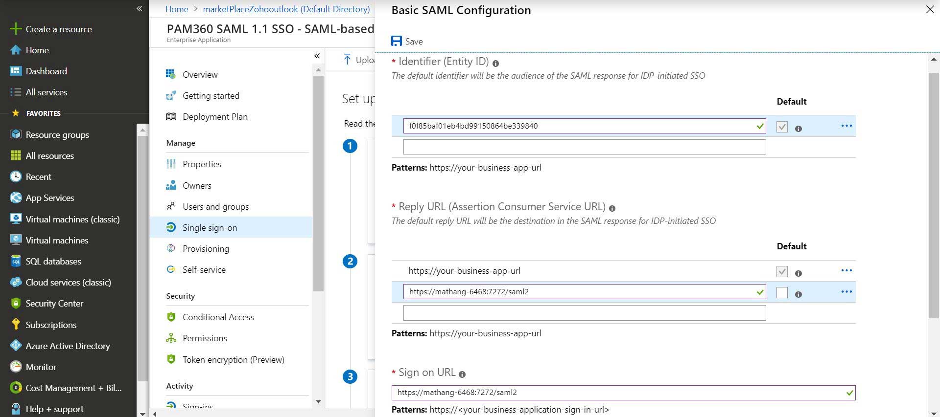- 将以上从PAM360中获取的SAML配置保存到Azure门户中。