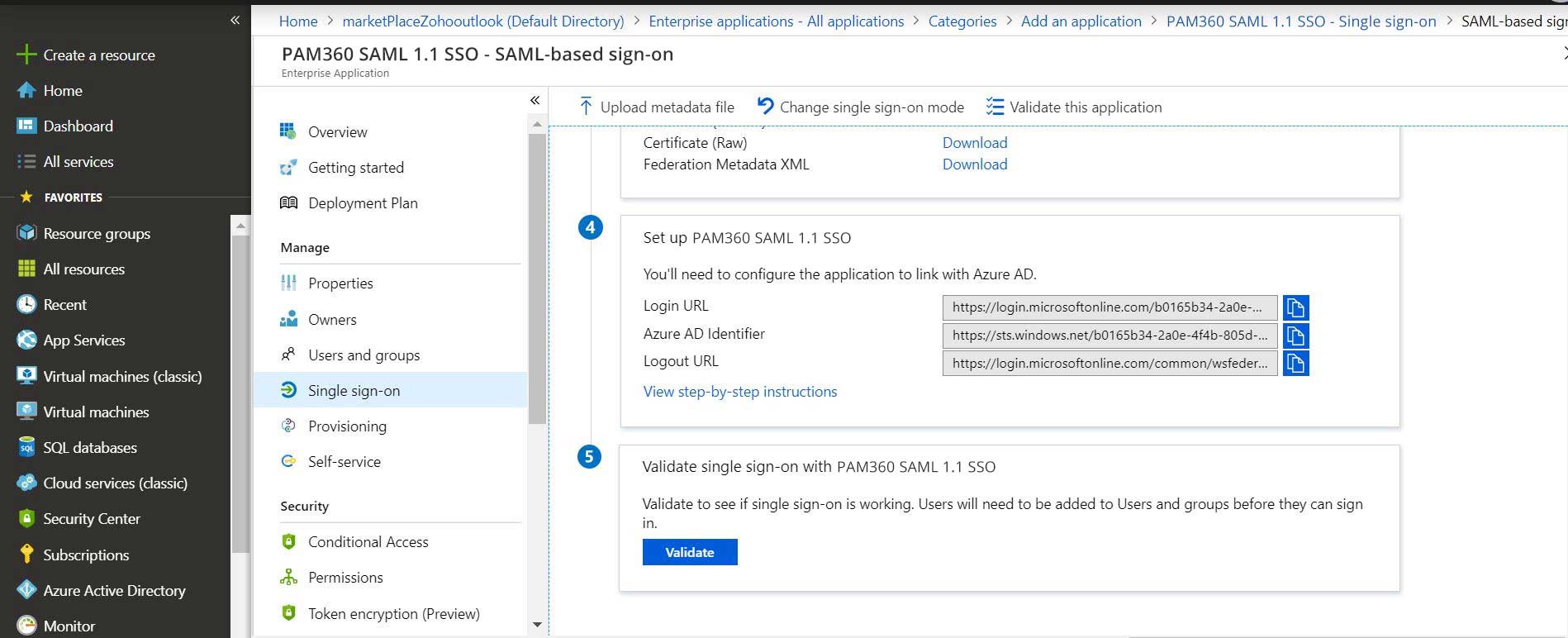 - 如果您需要验证单点登录是否有效,请到Azure门户,在PAM360 SAML 1.1 SSO的验证单点登录下点击验证。