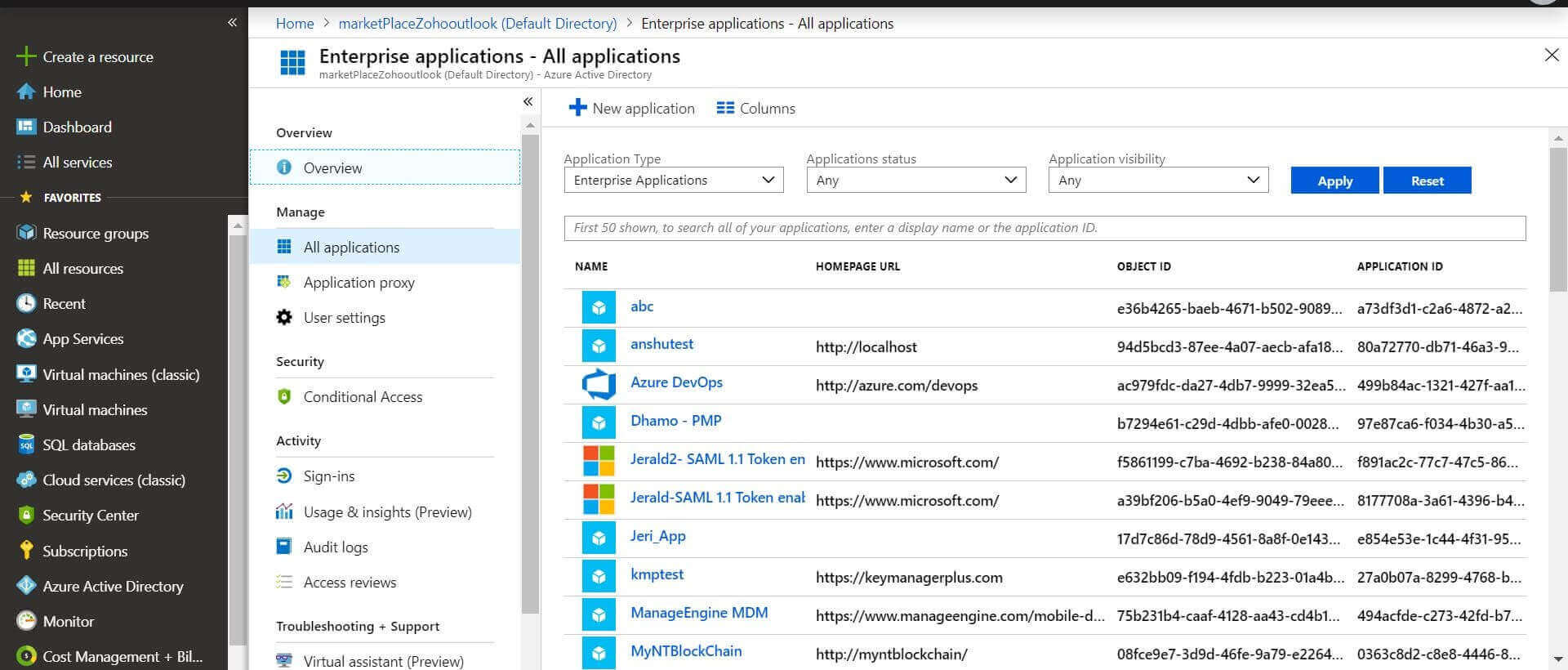 - 从左侧列表中选择Azure Active Directory,并在管理选项卡下选择企业应用。