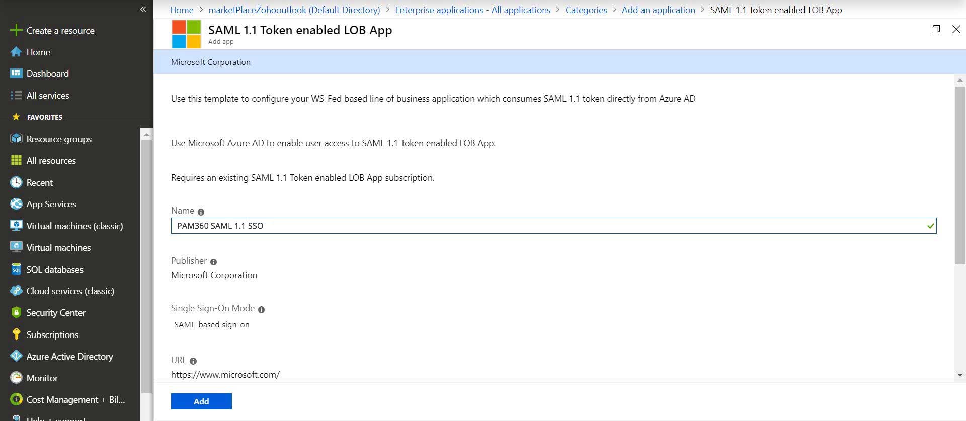 - 点击右上角的方形图标以最大化应用窗口,请在名称字段输入PAM360SAML 1.1SSO,然后点击添加。