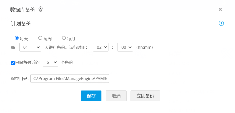 - 默认备份文件存储在<PAM360_Home >\Backup目录下,所在主机应该是运行PAM360服务器的主机。 如果需要,可以改变其存储路径。
