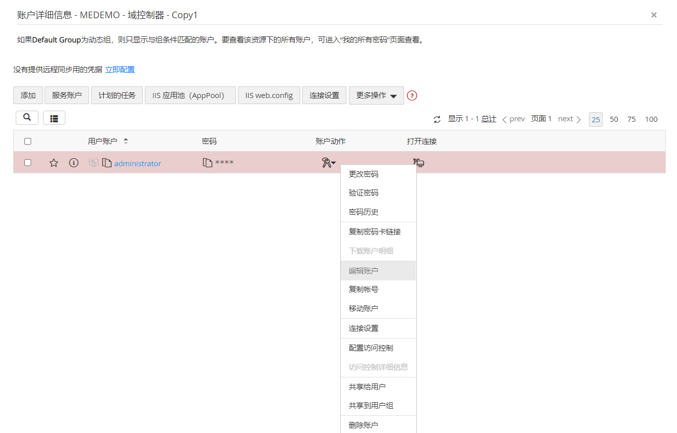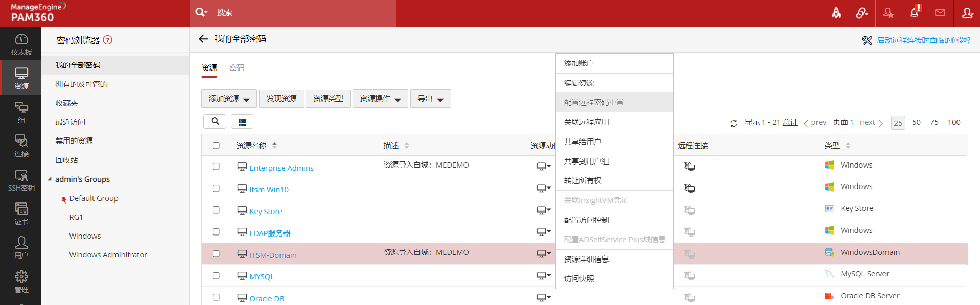 - 点击Windows域PAM360Machine的"资源操作"图标然后从下拉列表中选择配置密码重置。