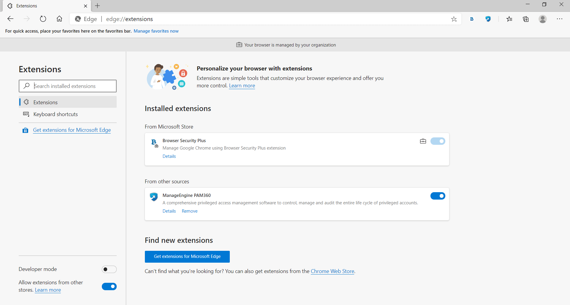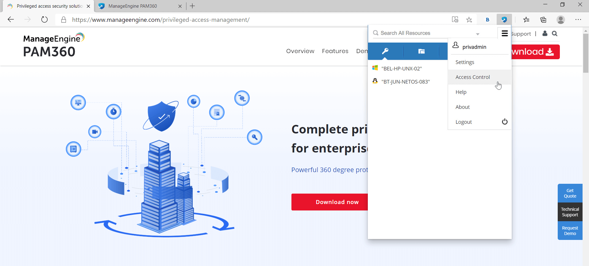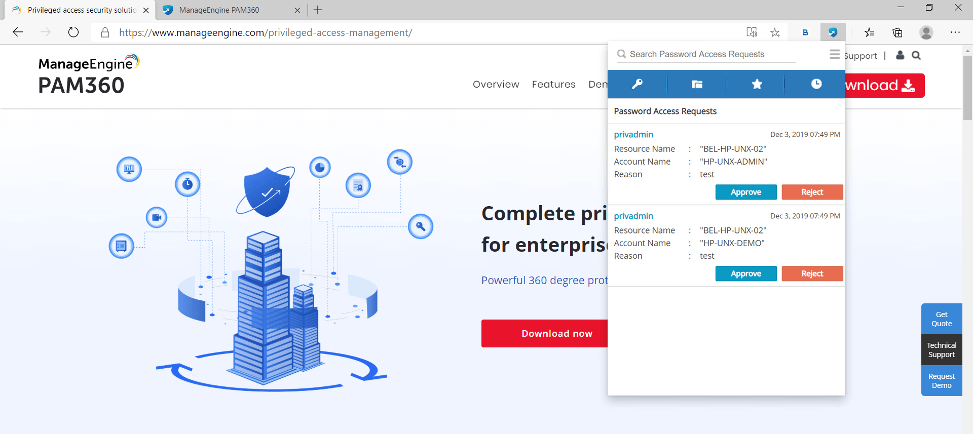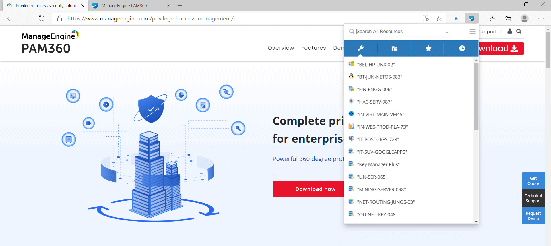 为使密码管理和自动登录活动更加顺滑, PAM360提供通过本机浏览器扩展程序安全地同步密码的选项。该扩展可以帮助您执行特权访问管理操作,如发送和审批密码访问请求、自动填充密码到网站、通过远程网关自动加载 RDP 和 SSH 会话。 此外,该扩展允许您查看所有密码、资源组、收藏的资源、最近使用的资源和搜索选项。