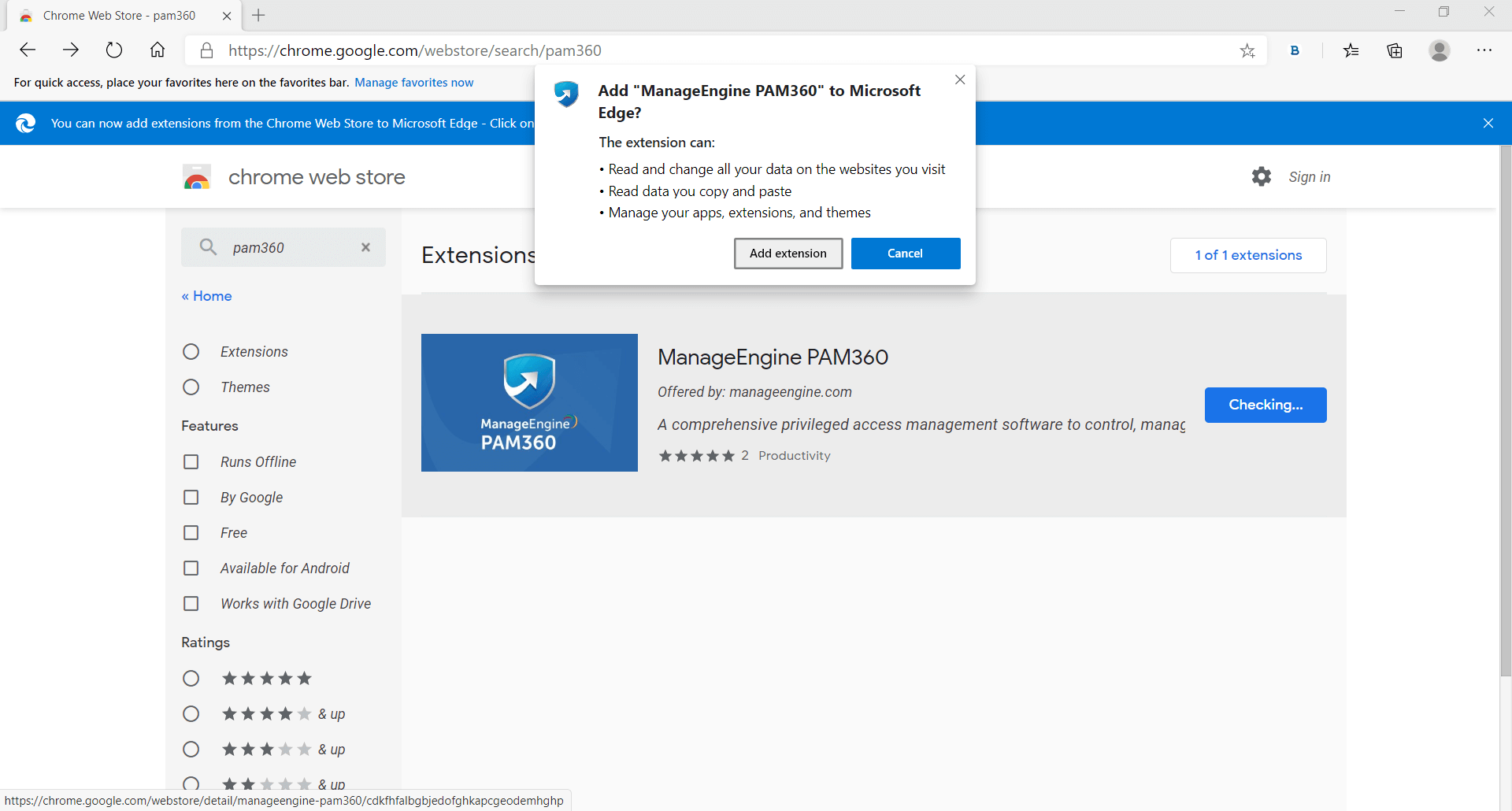 - 安装后,您将在浏览器中的地址栏看到 PAM360 的图标。单击该图标并按提示输入PAM360的主机的名称,以及连接端口。
