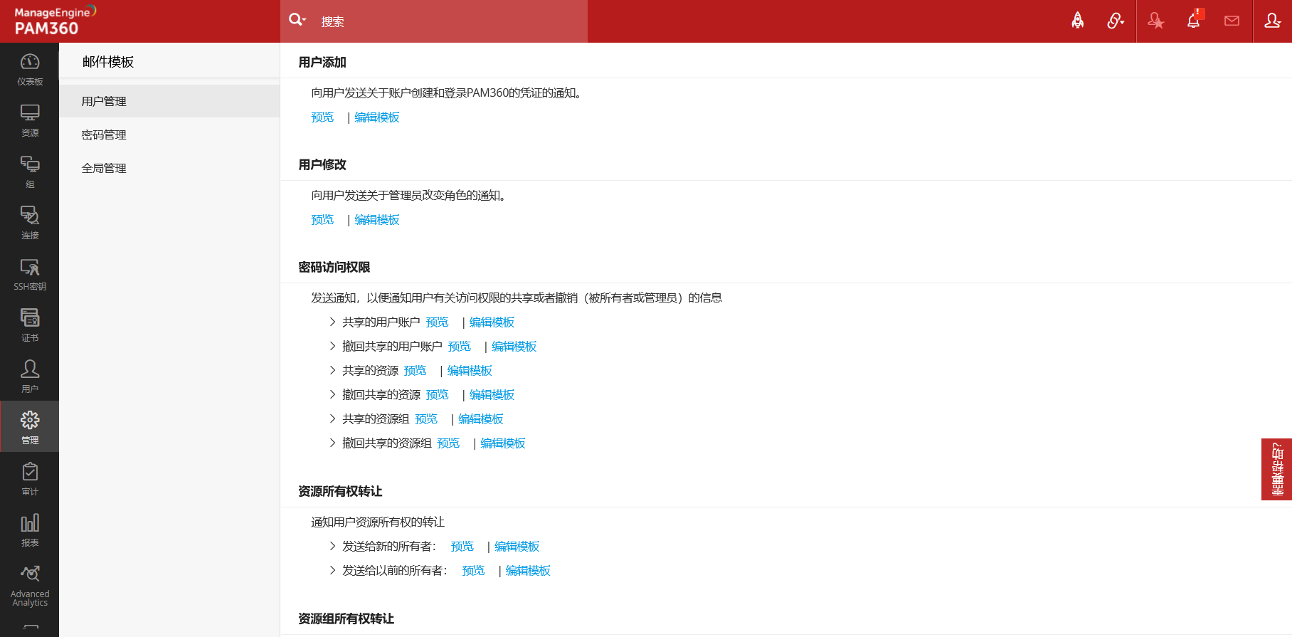 - 在打开的界面中,选择所需的分类 - 用户管理、密码管理或全局管理,对于不同类别或操作,如用户添加,用户修改,用户帐户共享等。都可以定制专用的电子邮件模板,
