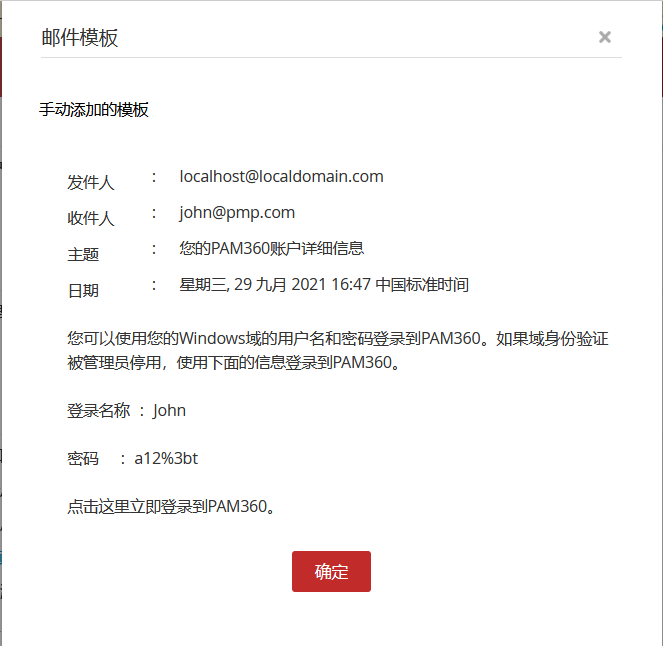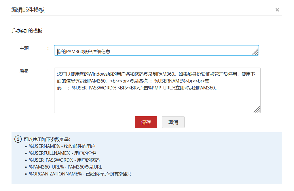 PAM360在执行各种密码动作时,会发送邮件通知。PAM360默认已经为您预置了邮件通知内容。如果需要,您也可以对邮件内容进行定制。